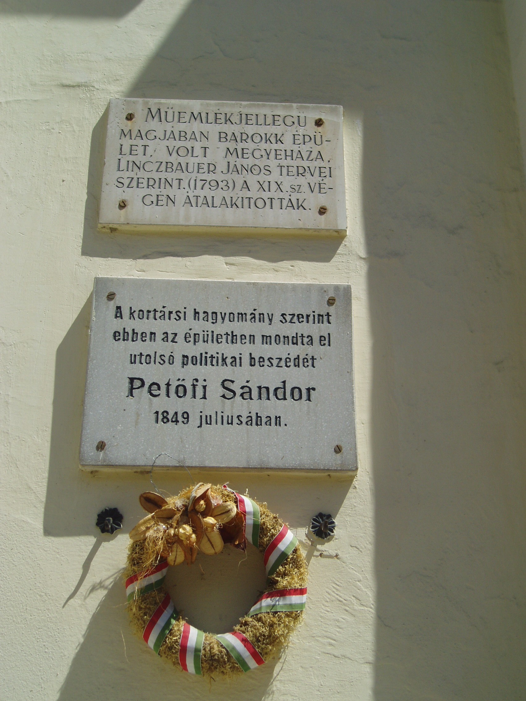 Nyilvános 1055 | 1507 | Gyula, Petőfi tér 3. Régi Vármegyeháza | A városközponti háromszög alakú hangulatos tér csaknem minden épülete történelmi vagy műemléki érték. Az egykori Vármegyeháza - a mai Városháza - a tér legszebb épülete. Eredeti formájában a XVIII. század utolsó harmadában épült az akkoriban újjátelepült Békés megye közigazgatási központjának. Azóta többszöri átépítéseket, alakításokat, bővítéseket hajtottak végre rajta. Ezek eredményeképpen ma barokk, klasszicista, romantikus és eklektikus részleteket egyaránt megfigyelhetünk az összességében eklektikus hatású épületen. A Vármegyeháza sok nevezetes eseménynek volt helyszíne. 1848. március 22-én az udvaron ismertették az egybegyűlt sokaság előtt a Pesten zajló eseményeket. A helyi hagyomány szerint 1849 júliusában a védbizottmány egyik ülésén mondta el utolsó politikai beszédét Petőfi Sándor. A költő akkoriban Mezőberényben tartózkodott, onnan rándult át a megyeszékhelyre. Az eseményt az épület homlokzatán emléktábla örökíti meg. A fénykép 2007 júliusában készült. Felh. irod.: Czeglédi Imre: Gyula útikalauz. 2. jav., bőv. kiad. Gyula, 1995 |