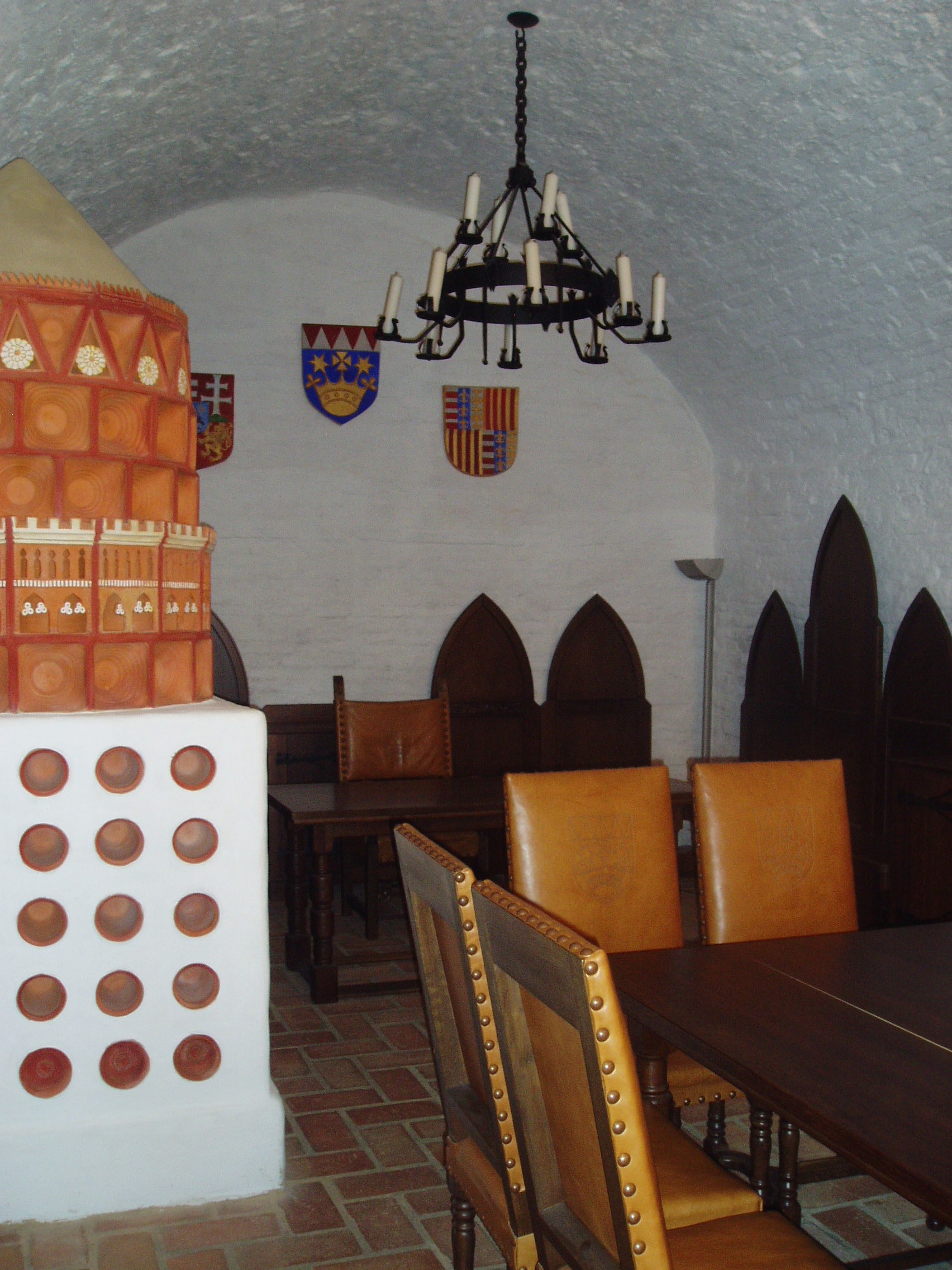 Nyilvános 1131 | 1662 | Gyula, Vár | A vár belső termeiben a közelmúltban nyílt meg a Vármúzeum. Berendezett termei és kápolnája igazi korabeli hangulatot nyújtanak a látogatóknak. A képen az emeleten található lovagterem részlete látható egy XVI. századi kályha rekonstrukciójával. A fénykép 2007 júliusában készült. |