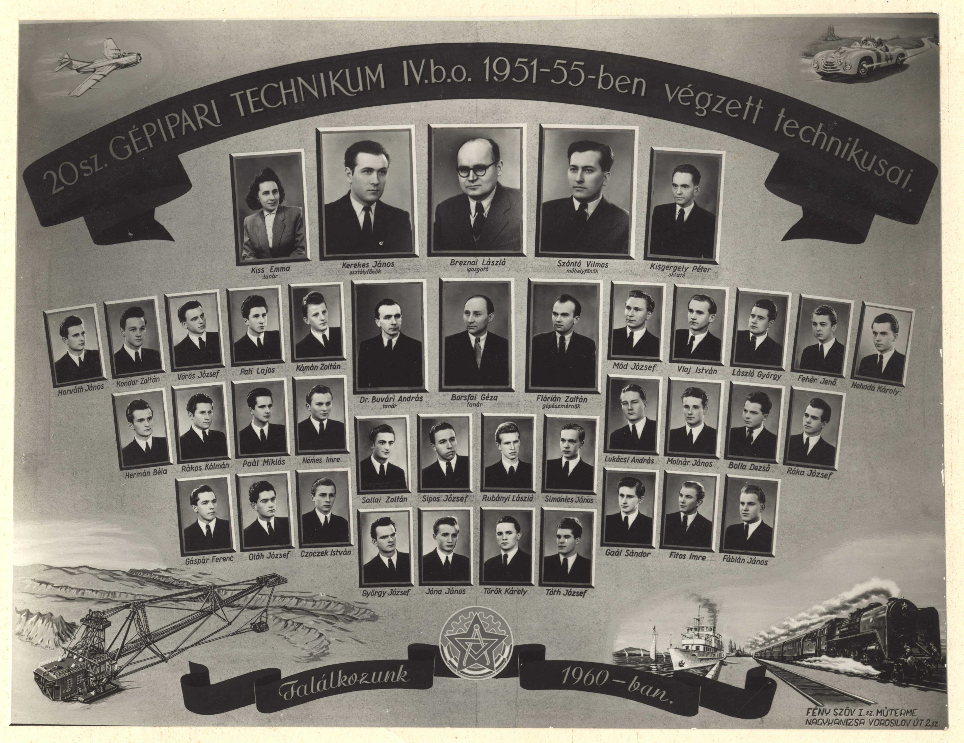Nyilvános 1429 | 2502 | 20 sz. Gépipari Technikum IV.b.o. 1951-55-ben végzett technikusai | Borsfai Géza tanár Breznai László igazgató Buvári András dr. tanár Flórián Zoltán gépészmérnök Kerekes János osztályfőnök Kisgergely Péter oktató Kiss Emma tanár Szántó Vilmos műhelyfőnök Bolla Dezső Czoczek István Fábián János Fehér Jenő Fitos Imre Gaál Sándor Gáspár Ferenc György József Hermán Béla Horváth János Jóna János Kámán Zoltán Kondor Zoltán László György Lukácsi András Mód József Molnár János Nehoda Károly Nemes Imre Oláh József Paál Miklós Pati Lajos Rákos Kálmán Róka József Rubányi László Sallai Zoltán Simonics János Sipos József Tóth József Török Károly Vlaj István Vörös József |
