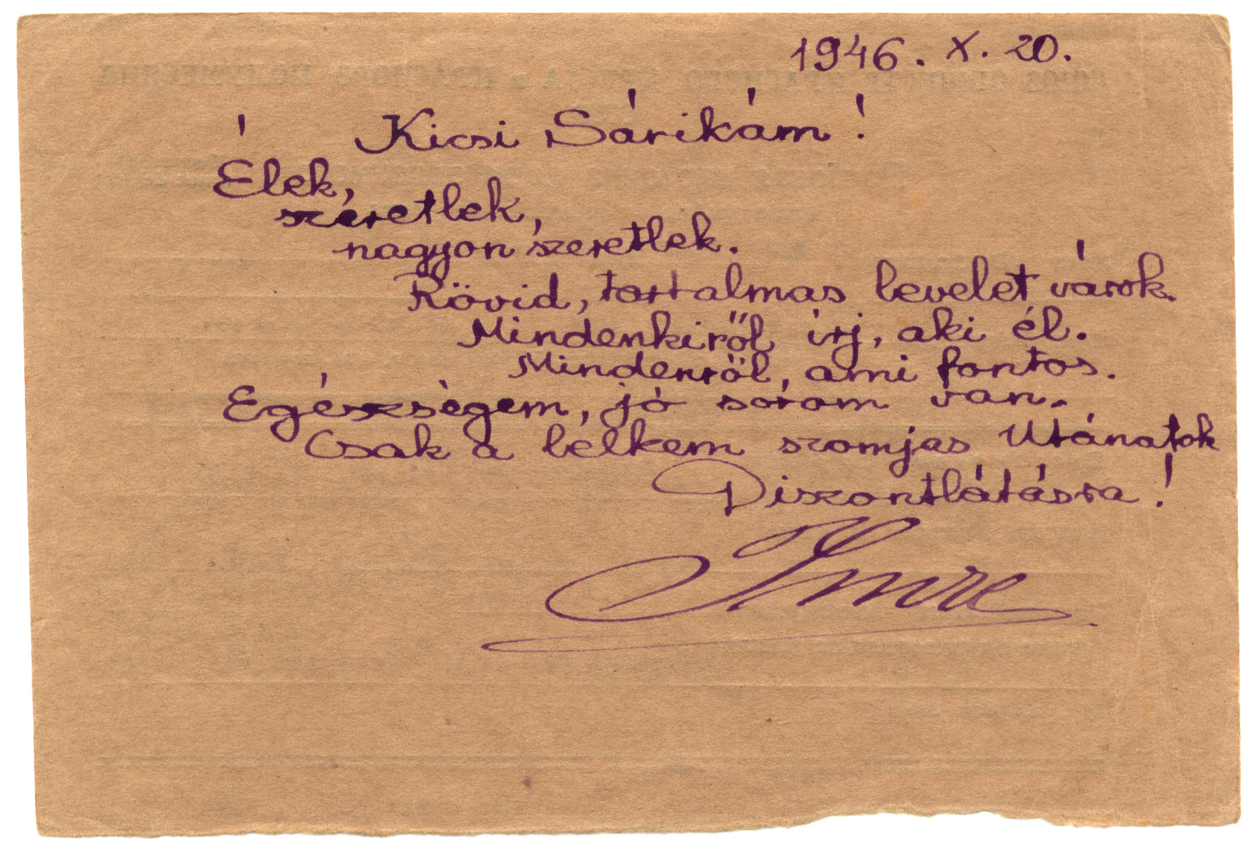 Nyilvános 1407 | 2500 | Vértes Imréné | Letenye IV. Zala vm. Magyarország Vértes Imre hdgy. C.C.C.P. Moszkva Vöröskereszt, Postafiók 430/1. c. 1946.X.20. Kicsi Sárikám! Élek, szeretlek, nagyon szeretlek. Rövid, tartalmas levelet várok. Mindenkiről írj, aki él. Mindenről, ami fontos. Egészségem, jó sorom van. Csak a lelkem szomjas utánatok. Viszontlátásra! Imre |