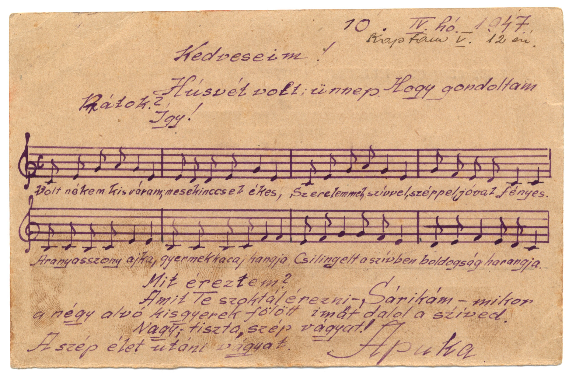 Nyilvános 1415 | 2353 | Vértes Imréné | Letenye IV. - Zala vm. Magyarország Vértes Imre hdgy. C.C.C.P. "Moszkva" Vöröskereszt, Postafiók 430/1. c. 10. IV. hó 1947. (Kaptam V. 12-én) Kedveseim! Húsvét volt, ünnep. Hogy gondoltam Rátok? Így! Volt nékem kis váram, mesekinccsel ékes, Szerelemmel, szívvel, széppel, jóval fényes. Aranyasszony ajka, gyermekkacaj hangja Csilingelt a szívben boldogság harangja. Mit éreztem? Amit Te szoktál érezni-, Sárikám - mikor a négy alvó kisgyerek fölött imát dalol a szíved. Nagy, tiszta, szép vágyat! A szép élet utáni vágyat. Apuka |