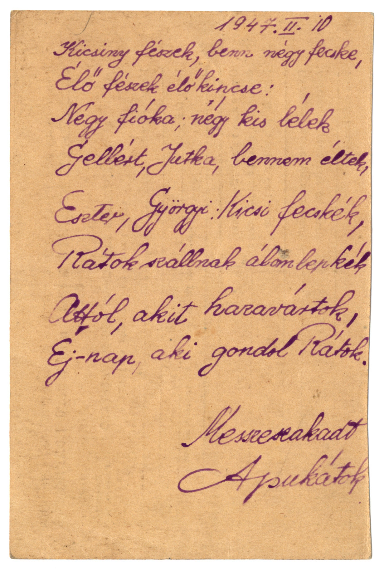 Nyilvános 1396 | 2352 | A Négy kis Vértesrajkónak | Letenye IV. - Zala vm. Magyarország Vértes Imre U.R.S.S. "Moszkva" Vöröskereszt, Postafiók 430/1. c. 1947. II. 10. Kicsiny fészek, benn négy fecske, Élő fészek élő kincse: Négy fióka; négy kis lélek Gellért, Jutka, bennem éltek, Eszter, Györgyi: Kicsi fecskék, Rátok szállnak álomlepkék Attól, akit hazavártok, Éj-nap, aki gondol Rátok. Messzeszakadt Apukátok |