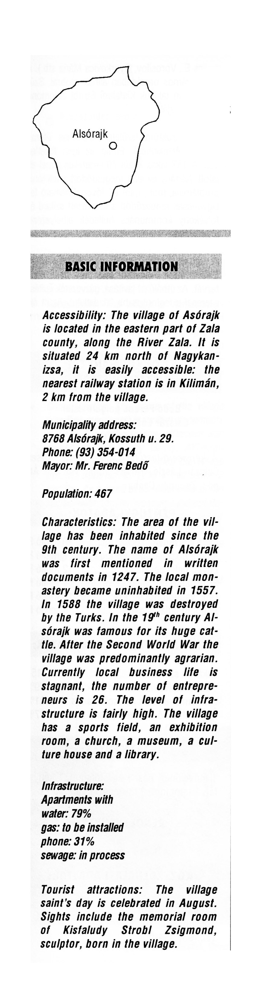 Nyilvános 2116 | 6193 | Alsórajk | BASIC INFORMATION Accessibility: The village of Alsórajk is located in the eastern part of Zala county, along the River Zala. It is situated 24 km north of Nagykanizsa, it is easily accessible: the nearest railway station is in Kilimán, 2 km from the village. Municipality address: 8768 Alsórajk, Kossuth u. 29. Phone: (93) 354-014 Mayor: Mr. Ferenc Bedő Population: 467 Characteristics: The area of the village has been inhabited since the 9th century. The name of Alsórajk was first mentioned in written documents in 1247. The local monastery became uninhabited in 1557. In 1588 the village was destroyed by the Turks. In the 19th century Alsórajk was famous for its huge cattle. After the Second World War the village was predominantly agrarian. Currently local business life is stagnant, the number of entrepreneurs is 26. The level of infrastructure is fairly high. The village has a sports field, an exhibition room, a church, a museum, a culture house and a library. Infrastructure: Apartments with water: 79% gas: to be installed phone: 31% sewage: in process Tourist attractions: The village saint's day is celebrated in August. Sights include the memorial room of Kisfaludy Strobl Zsigmond, sculptor, born in the village. This text came from the following book: Title: Handbook of Zala county (Zala megye kézikönyve) Series: County handbooks of Hungary (Magyarország megyei kézikönyvei) Chief editor: Hóbor József Publisher: (Hatvan), CEBA-Hungary Ltd, 1998 ETO: 908.439.121(035) ; 050.8(439.121) ISBN: 963-9089-18-2 Pages: 488-1040 p. Remark: Closed on: 1998. márc. 31. |