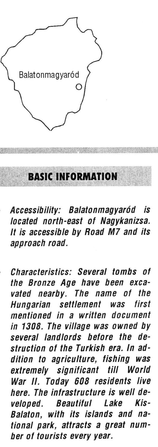 Nyilvános 2224 | 6100 | Balatonmagyaród | BASIC INFORMATION Accessibility: Balatonmagyaród is located north-east of Nagykanizsa. It is accessible by Road M7 and its approach road. Characteristics: Several tombs of the Bronze Age have been excavated nearby. The name of the Hungarian settlement was first mentioned in a written document in 1308. The village was owned by several landlords before the destruction of the Turkish era. In addition to agriculture, fishing was extremely significant till World War II. Today 608 residents live here. The infrastructure is well developed. Beautiful Lake Kis-Balaton, with its islands and national park, attracts a great number of tourists every year. This text came from the following book: Title: Handbook of Zala county (Zala megye kézikönyve) Series: County handbooks of Hungary (Magyarország megyei kézikönyvei) Chief editor: Hóbor József Publisher: (Hatvan), CEBA-Hungary Ltd, 1998 ETO: 908.439.121(035) ; 050.8(439.121) ISBN: 963-9089-18-2 Pages: 488-1040 p. Remark: Closed on: 1998. márc. 31. |