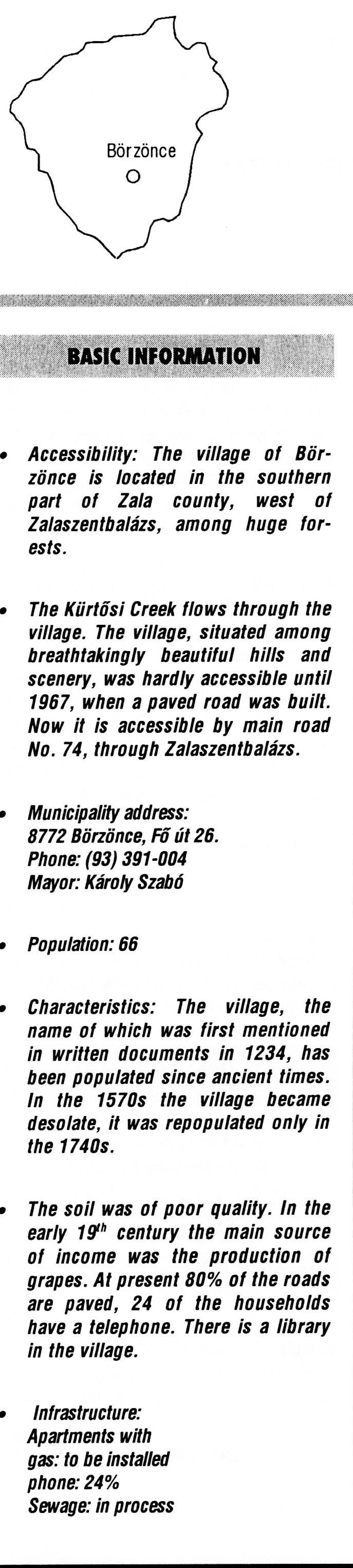 Nyilvános 2351 | 6285 | Rövid leírás | Teljes leírás (1.57 KB) | Börzönce BASIC INFORMATION Accessibility: The village of Börzönce is located in the southern part of Zala county, west of Zalaszentbalázs, among huge forests. The Kürtősi Creek flows through the village. The village, situated among breathtakingly beautiful hills and scenery, was hardly accessible until 1967, when a paved road was built. Now it is accessible by main road No. 74, through Zalaszentbalázs. Municipality address: 8772 Börzönce, Fő út 26. Phone: (93) 391-004 Mayor: Károly Szabó Population: 66 Characteristics: The village, the name of which was first mentioned in written documents in 1234, has been populated since ancient times. In the 1570s the village became desolate, it was repopulated only in the 1740s. The soil was of poor quality. In the early 19th century the main source of income was the production of grapes. At present 80% of the roads are paved, 24 of the households have a telephone. There is a library in the village. Infrastructure: Apartments with gas: to be installed phone: 24% Sewage: in process This text came from the following book: Title: Handbook of Zala county (Zala megye kézikönyve) Series: County handbooks of Hungary (Magyarország megyei kézikönyvei) Chief editor: Hóbor József Publisher: (Hatvan), CEBA-Hungary Ltd, 1998 ETO: 908.439.121(035) ; 050.8(439.121) ISBN: 963-9089-18-2 Pages: 488-1040 p. Remark: Closed on: 1998. márc. 31. |