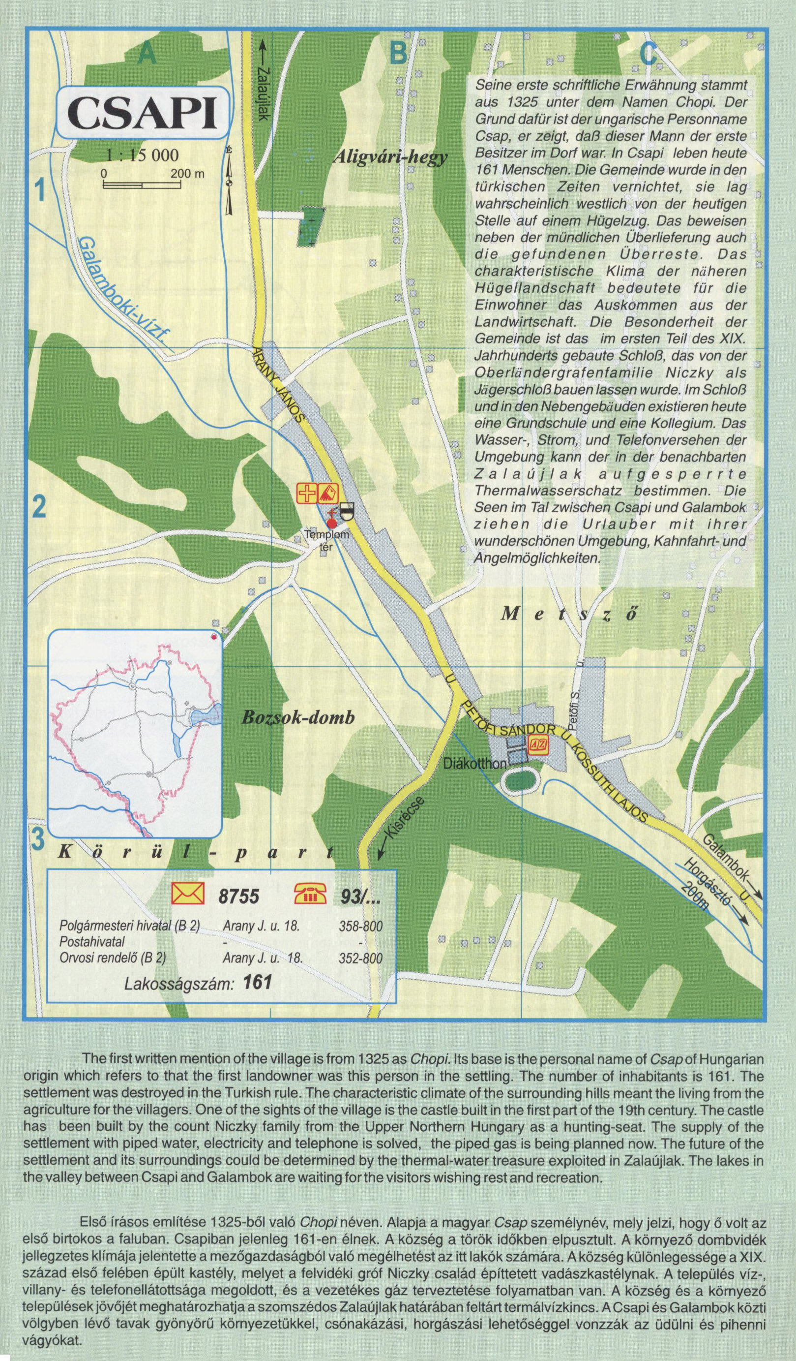 Nyilvános 2400 | 8128 | CSAPI | Első írásos említése 1325-ből való Chopi néven. Alapja a magyar Csap személynév, mely jelzi, hogy ő volt az első birtokos a faluban. Csapiban jelenleg 161-en élnek. A község a török időkben elpusztult. A környező dombvidék jellegzetes klímája jelentette a mezőgazdaságból való megélhetést az itt lakók számára. A község különlegessége a XIX. század első felében épült kastély, melyet a felvidéki gróf Niczky család építtetett vadászkastélynak. A település víz-, villany- és telefonellátottsága megoldott, és a vezetékes gáz terveztetése folyamatban van. A község és a környező települések jövőjét meghatározhatja a szomszédos Zalaújlak határában feltárt termálvízkincs. ACsapi és Galambok közti völgyben lévő tavak gyönyörű környezetükkel, csónakázási, horgászási lehetőséggel vonzzák az üdülni és pihenni vágyókat. Seine erste schriftliche Erwähnung stammt aus 1325 unter dem Namen Chopi. Der Grund dafür ist der ungarische Personname Csap, er zeigt, daß dieser Mann der erste Besitzer im Dorf war. In Csapi leben heute 161 Menschen. Die Gemeinde wurde in den türkischen Zeiten vernichtet, sie lag wahrscheinlich westlich von der heutigen Stelle auf einem Hügelzug. Das beweisen neben der mündlichen Überlieferung auch die gefundenen Überreste. Das charakteristische Klima der näheren Hügellandschaft bedeutete für die Einwohner das Auskommen aus der Landwirtschaft. Die Besonderheit der Gemeinde ist das im ersten Teil des XIX. Jahrhunderts gebaute Schloß, das von der Oberländergrafenfamilie Niczky als Jägerschloß bauen lassen wurde. Im Schloß und in den Nebengebäuden existieren heute eine Grundschule und eine Kollegium. Das Wasser-, Strom, und Telefonversehen der Umgebung kann der in der benachbarten Z a I a ú j I a k aufgesperrte Thermalwasserschatz bestimmen. Die Seen im Tal zwischen Csapi und Galambok ziehen die Urlauber mit ihrer wunderschönen Umgebung, Kahnfahrt- und Angelmöglichkeiten. The first written mention of the village is from 1325 as Chopi. Its base is the personal name of Csap of Hungarian origin which refers to that the first landowner was this person in the settling. The number of inhabitants is 161. The settlement was destroyed in the Turkish rule. The characteristic climate of the surrounding hills meant the living from the agriculture for the villagers. One of the sights of the village is the castle built in the first part of the 19th century. The castle has been built by the count Niczky family from the Upper Northern Hungary as a hunting-seat. The supply of the settlement with piped water, electricity and telephone is solved, the piped gas is being planned now. The future of the settlement and its surroundings could be determined by the thermal-water treasure exploited in Zalaújlak. The lakes in the valley between Csapi and Galambok are waiting forthe visitors wishing rest and recreation. A részlet a következő kiadványból származik/Die Teile stammen vom volgenden Buch/This text came from the following book: Cím/Titel/Title: Zala megye településeinek atlasza - 257 település részletes térképe/Atlas der Komitat Zala - 257 Detailte Siedlungskarten/Zala county\'s Atlas - 257 settlement maps. Közreműködő/contributor: Lackner László (1943) (fotó) Kiadás/Ausgabe/Publisher: Gyula : HISZI-MAP, 1997 Sorozat/Serie/Series: Indulástól - megérkezésig... ETO: 912(439.121-2) ; 908.439.121 Cutter: Z 19 ISBN: 963-610-025-4 Oldalszám/Seiten/Pages: 323, 81 p. Megjegyzés/Note: Lezárva/Abgeschlossen am/Closed am: 1997. máj. 30. |