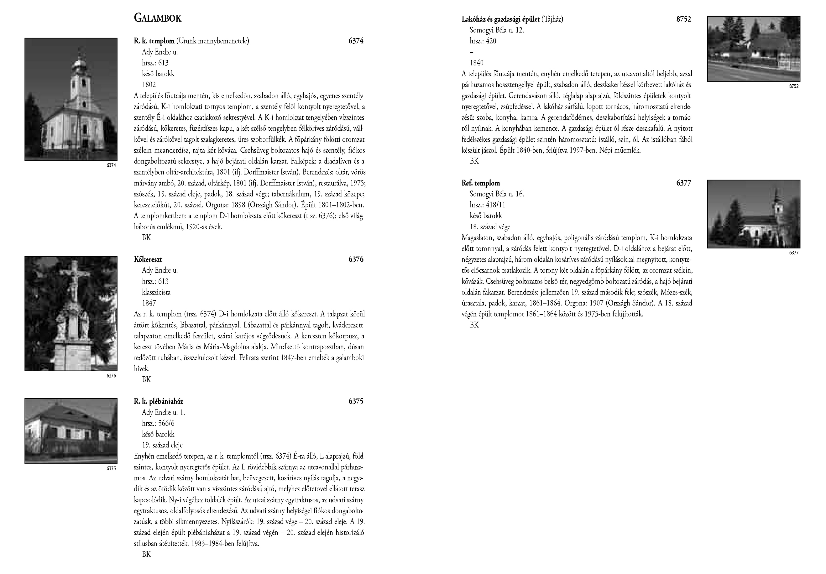 Nyilvános 2176 | 4542 | Galambok - Magyarország műemlékjegyzéke - Zala megye 2006 028-029old | A részlet szövege: GALAMBOK 6374 R. k. templom (Urunk mennybemenetele) Ady Endre u. hrsz.: 613 késő barokk 1802 A település főutcája mentén, kis emelkedőn, szabadon álló, egyhajós, egyenes szentélyzáródású, K-i homlokzati tornyos templom, a szentély felől kontyolt nyeregtetővel, a szentély É-i oldalához csatlakozó sekrestyével. A K-i homlokzat tengelyében vízszintes záródású, kőkeretes, füzérdíszes kapu, a két szélső tengelyben félköríves záródású, vállkővel és zárókővel tagolt szalagkeretes, üres szoborfülkék. A főpárkány fölötti oromzat szélein meanderdísz, rajta két kőváza. Csehsüveg boltozatos hajó és szentély, fiókos dongaboltozatú sekrestye, a hajó bejárati oldalán karzat. Falképek: a diadalíven és a szentélyben oltár-architektúra, 1801 (ifj. Dorffmaister István). Berendezés: oltár, vörös márvány ambó, 20. század, oltárkép, 1801 (ifj. Dorffmaister István), restaurálva, 1975; szószék, 19. század eleje, padok, 18. század vége; tabernákulum, 19. század közepe; keresztelőkút, 20. század. Orgona: 1898 (Országh Sándor). Épült 1801–1802-ben. A templomkertben: a templom D-i homlokzata előtt kőkereszt (trsz. 6376); első világháborús emlékmű, 1920-as évek. BK Kőkereszt 6376 Ady Endre u. hrsz.: 613 klasszicista 1847 Az r. k. templom (trsz. 6374) D-i homlokzata előtt álló kőkereszt. A talapzat körül áttört kőkerítés, lábazattal, párkánnyal. Lábazattal és párkánnyal tagolt, kváderezett talapzaton emelkedő feszület, szárai karéjos végződésűek. A kereszten kőkorpusz, a kereszt tövében Mária és Mária-Magdolna alakja. Mindkettő kontraposztban, dúsan redőzött ruhában, összekulcsolt kézzel. Felirata szerint 1847-ben emelték a galamboki hívek. BK 6375 R. k. plébániaház 6375 Ady Endre u. 1. hrsz.: 566/6 késő barokk 19. század eleje Enyhén emelkedő terepen, az r. k. templomtól (trsz. 6374) É-ra álló, L alaprajzú, földszintes, kontyolt nyeregtetős épület. Az L rövidebbik szárnya az utcavonallal párhuzamos. Az udvari szárny homlokzatát hat, beüvegezett, kosáríves nyílás tagolja, a negyedik és az ötödik között van a vízszintes záródású ajtó, melyhez előtetővel ellátott terasz kapcsolódik. Ny-i végéhez toldalék épült. Az utcai szárny egytraktusos, az udvari szárny egytraktusos, oldalfolyosós elrendezésű. Az udvari szárny helyiségei fiókos dongaboltozatúak, a többi síkmennyezetes. Nyílászárók: 19. század vége – 20. század eleje. A 19. század elején épült plébániaházat a 19. század végén – 20. század elején historizáló stílusban átépítették. 1983–1984-ben felújítva. BK Lakóház és gazdasági épület Somogyi Béla u. 12. hrsz.: 420 – (Tájház) 8752 A település főutcája mentén, enyhén emelkedő terepen, az utcavonaltól beljebb, azzal párhuzamos hossztengellyel épült, szabadon álló, deszkakerítéssel körbevett lakóház és gazdasági épület. Gerendavázon álló, téglalap alaprajzú, földszintes épületek kontyolt nyeregtetővel, zsúpfedéssel. A lakóház sárfalú, lopott tornácos, háromosztatú elrendezésű: szoba, konyha, kamra. A gerendafödémes, deszkaborítású helyiségek a tornácról nyílnak. A konyhában kemence. A gazdasági épület ól része deszkafalú. A nyitott fedélszékes gazdasági épület szintén háromosztatú: istálló, szín, ól. Az istállóban fából készült jászol. Épült 1840-ben, felújítva 1997-ben. Népi műemlék. BK Ref. templom 6377 Somogyi Béla u. 16. hrsz.: 418/11 késő barokk 18. század vége Magaslaton, szabadon álló, egyhajós, poligonális záródású templom, K-i homlokzata előtt toronnyal, a záródás felett kontyolt nyeregtetővel. D-i oldalához a bejárat előtt, négyzetes alaprajzú, három oldalán kosáríves záródású nyílásokkal megnyitott, kontytetős előcsarnok csatlakozik. A torony két oldalán a főpárkány fölött, az oromzat szélein, kővázák. Csehsüveg boltozatos belső tér, negyedgömb boltozatú záródás, a hajó bejárati oldalán fakarzat. Berendezés: jellemzően 19. század második fele; szószék, Mózes-szék, úrasztala, padok, karzat, 1861–1864. Orgona: 1907 (Országh Sándor). A 18. század végén épült templomot 1861–1864 között és 1975-ben felújították. BK A részlet a következő könyv online változatából származik: Cím: Magyarország műemlékjegyzéke Közreműködő: Haris Andrea. (szerk.) ; Kulturális Örökségvédelmi Hivatal (Budapest) (közread.) ; Somorjay Sélysette. (szerk.) ; Bardoly István (közrem.) Szerz. közl.: [sorozatszerk. Haris Andrea, Somorjay Sélysette] ; [mtárs Bardoly István] ; [közread. a] Kulturális Örökségvédelmi Hivatal. Kiadás: Budapest : KÖH, 2006 Kötetadat: Zala megye ISBN: 963-86510-7-5 ö ISBN: 963 7474 10 2 Nyelv: magyar A jegyzék a Kultúrális Örökségvédelmi Hivatal honlapján, a következő link alatt található: http://www.koh.hu/index.php?_mp=nyitolap&_amp=MUEML A fejléc adatairól 1. Objektum neve – törzsszám A fejléc első sora a műemlék eredeti rendeltetésének megfelelő nevet tartalmazza. Mögötte zárójelben templom esetében annak titulusa, más épületeknél indokolt esetben az eredeti rendeltetéstől eltérő, mai használatra utaló intézmény név (pl. városháza, múzeum, szálloda, oktatási intézmény hivatalos neve, stb.) olvasható. A törzsszám (trsz.) a műemlék egyetlen soha nem változó adata. A gyors azonosítás, illetve a törzsszám szerinti keresés lehetősége végett az objektummal egy sorban, a fejléc jobb szélén kiemelten jelenik meg. Összetartozó műemlék részek vagy történetileg egy együttest alkotó műemlékek sokszor külön törzsszámon lettek műemlékké nyilvánítva. Előfordulha
