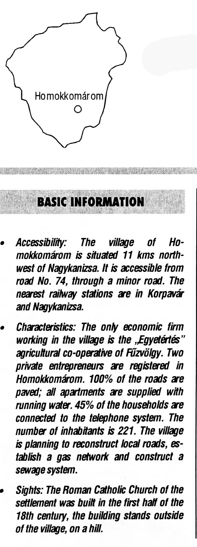 Nyilvános 2368 | 6475 | Homokkomárom | BASIC INFORMATION Accessibility: The village of Homokkomárom is situated 11 kms northwest of Nagykanizsa. It is accessible from road No. 74, through a minor road. The nearest railway stations are in Korpavár and Nagykanizsa. Characteristics: The only economic firm working in the village is the „Egyetértés” agricultural co-operative of Fűzvölgy. Two private entrepreneurs are registered in Homokkomárom. 100% of the roads are paved; all apartments are supplied with running water. 45% of the households are connected to the telephone system. The number of inhabitants is 221. The village is planning to reconstruct local roads, establish a gas network and construct a sewage system. Sights: The Roman Catholic Church of the settlement was built in the first half of the 18th century, the building stands outside of the village, on a hill. This text came from the following book: Title: Handbook of Zala county (Zala megye kézikönyve) Series: County handbooks of Hungary (Magyarország megyei kézikönyvei) Chief editor: Hóbor József Publisher: (Hatvan), CEBA-Hungary Ltd, 1998 ETO: 908.439.121(035) ; 050.8(439.121) ISBN: 963-9089-18-2 Pages: 488-1040 p. Remark: Closed on: 1998. márc. 31. |