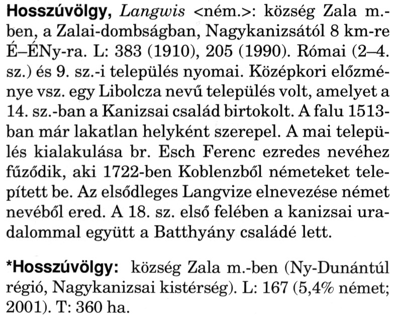Nyilvános 2202 | 6009 | A szócikkek felismertetett szövege: | (A csillag után a kiegészítő kötetből származó szöveg következik) Hosszúvölgy, Langwis <ném.>: község Zala m.-ben, a Zalai-dombságban, Nagykanizsától 8 km-re É-ÉNy-ra. L: 383 (1910), 205 (1990). Római (2-4. sz.) és 9. sz.-i település nyomai. Középkori előzménye vsz. egy Libolcza nevű település volt, amelyet a 14. sz.-ban a Kanizsai család birtokolt. A falu 1513-ban már lakatlan helyként szerepel. A mai település kialakulása br. Esch Ferenc ezredes nevéhez fűződik, aki 1722-ben Koblenzből németeket telepített be. Az elsődleges Langvize elnevezése német nevéből ered. A 18. sz. első felében a kanizsai uradalommal együtt a Batthyány családé lett. *Hosszúvölgy: község Zala m.-ben (Ny-Dunántúl régió, Nagykanizsai kistérség). L: 167 (5,4% német; 2001). T: 360 ha. A szócikkek a következő lexikonból származnak: Cím: Magyar nagylexikon Közreműködő: Élesztős László (1949) (szerk.) ; Barabás Éva (1943) (szerk.) ; Berényi Gábor (1946) (szerk.) ; Bárány Lászlóné (szerk.) ; Adelmann-né Kertész Judit (1945) (közrem.) ; Froemel Károlyné Jáky Éva (1936) (közrem.) ; Akadémiai Kiadó és Nyomda Vállala Szerz. közl.: [... Élesztős László főszerk.] ; [szerk. Barabás Éva et al.] ; [bibliogr. Adelmanné Kertész Judit] ; [kész. az Akadémiai Kiadó Magyar Nagylexikon Szerkesztőségében] Kiadás: Budapest : Akad. K., 1993- Kötetei: 1. köt., A - Anc 2. köt., And - Bag 3. köt., Bah - Bij 4. köt., Bik - Bz 5. köt., C - Csem 6. köt., Csen - Ec 7. köt., Ed - Fe 8. köt., Ff - Gyep 9. köt., Gyer - Iq 10. köt., Ir - Kip 11. köt., Kir - Lem 12. köt., Len - Mep 13. köt., Mer - Nyk 14. köt., Nyl - Pom 15. köt., Pon - Sek 16. köt., Sel - Szö 17. köt., Szp - Ung 18. köt., Unh - Z 19. köt., Kiegészítő kötet, A - Z ETO jelzet: 030=945.11 Szakjelzet: 030 Cutter: M 14 ISBN: 963-05-6611-7 [!ISBN 963-05-6615-X] Nyelv: magyar Megjegyzés: Az 5. kötettől kiad. a Magyar Nagylexikon Kiadó ; A 6. kötettől főszerk. Berényi Gábor ; A 6. kötettől szakszerk. Bárány Lászlóné et al. ; A 6. kötettől bibliogr. Froemel Károlyné ; Bibliogr. a szócikkek végén |