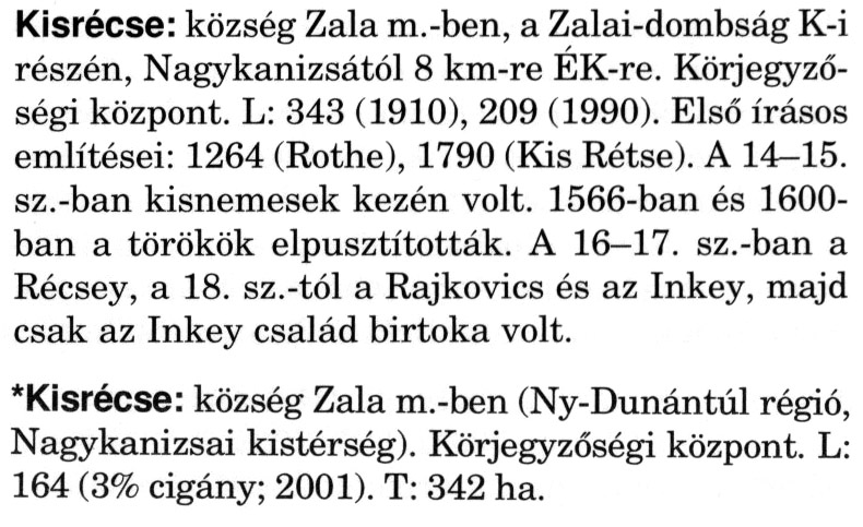 Nyilvános 2335 | 6171 | Rövid leírás | Teljes leírás (2.25 KB) | A szócikkek felismertetett szövege: (A csillag után a kiegészítő kötetből származó szöveg következik) Kisrécse: község Zala m.-ben, a Zalai-dombság K-i részén, Nagykanizsától 8 km-re ÉK-re. Körjegyzőségi központ. L: 343 (1910), 209 (1990). Első írásos említései: 1264 (Rothe), 1790 (Kis Rétse). A 14-15. sz.-ban kisnemesek kezén volt. 1566-ban és 1600-ban a törökök elpusztították. A 16—17. sz.-ban a Récsey, a 18. sz.-tól a Rajkovics és az Inkey, majd csak az Inkey család birtoka volt. *Kisrécse: község Zala m.-ben (Ny-Dunántúl régió, Nagykanizsai kistérség). Körjegyzőségi központ. L: 164 (3% cigány; 2001). T: 342 ha. A szócikkek a következő lexikonból származnak: Cím: Magyar nagylexikon Közreműködő: Élesztős László (1949) (szerk.) ; Barabás Éva (1943) (szerk.) ; Berényi Gábor (1946) (szerk.) ; Bárány Lászlóné (szerk.) ; Adelmann-né Kertész Judit (1945) (közrem.) ; Froemel Károlyné Jáky Éva (1936) (közrem.) ; Akadémiai Kiadó és Nyomda Vállala Szerz. közl.: [... Élesztős László főszerk.] ; [szerk. Barabás Éva et al.] ; [bibliogr. Adelmanné Kertész Judit] ; [kész. az Akadémiai Kiadó Magyar Nagylexikon Szerkesztőségében] Kiadás: Budapest : Akad. K., 1993- Kötetei: 1. köt., A - Anc 2. köt., And - Bag 3. köt., Bah - Bij 4. köt., Bik - Bz 5. köt., C - Csem 6. köt., Csen - Ec 7. köt., Ed - Fe 8. köt., Ff - Gyep 9. köt., Gyer - Iq 10. köt., Ir - Kip 11. köt., Kir - Lem 12. köt., Len - Mep 13. köt., Mer - Nyk 14. köt., Nyl - Pom 15. köt., Pon - Sek 16. köt., Sel - Szö 17. köt., Szp - Ung 18. köt., Unh - Z 19. köt., Kiegészítő kötet, A - Z ETO jelzet: 030=945.11 Szakjelzet: 030 Cutter: M 14 ISBN: 963-05-6611-7 [!ISBN 963-05-6615-X] Nyelv: magyar Megjegyzés: Az 5. kötettől kiad. a Magyar Nagylexikon Kiadó ; A 6. kötettől főszerk. Berényi Gábor ; A 6. kötettől szakszerk. Bárány Lászlóné et al. ; A 6. kötettől bibliogr. Froemel Károlyné ; Bibliogr. a szócikkek végén |