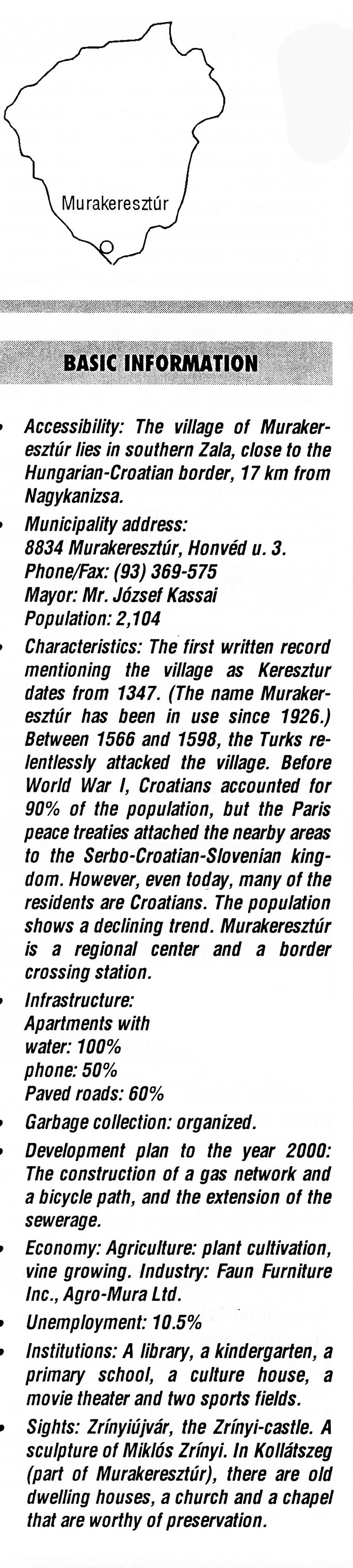 Nyilvános 1968 | 5700 | Murakeresztúr | BASIC INFORMATION Accessibility: The village of Murakeresztúr lies in southern Zala, close to the Hungarian-Croatian border, 17 km from Nagykanizsa. Municipality address: 8834 Murakeresztúr, Honvéd u. 3. Phone/Fax: (93) 369-575 Mayor: Mr. József Kassai Population: 2,104 Characteristics: The first written record mentioning the village as Keresztur dates from 1347. (The name Murakeresztúr has been in use since 1926.) Between 1566 and 1598, the Turks relentlessly attacked the village. Before World War I, Croatians accounted for 90% of the population, but the Paris peace treaties attached the nearby areas to the Serbo-Croatian-Slovenian kingdom. However, even today, many of the residents are Croatians. The population shows a declining trend. Murakeresztúr is a regional center and a border crossing station. Infrastructure: Apartments with water: 100% phone: 50% Paved roads: 60% Garbage collection: organized. Development plan to the year 2000: The construction of a gas network and a bicycle path, and the extension of the sewerage. Economy: Agriculture: plant cultivation, vine growing. Industry: Faun Furniture Inc., Agro-Mura Ltd. Unemployment: 10.5% Institutions: A library, a kindergarten, a primary school, a culture house, a movie theater and two sports fields. Sights: Zrínyiújvár, the Zrínyi-castle. A sculpture of Miklós Zrínyi. In Kollátszeg (part of Murakeresztúr), there are old dwelling houses, a church and a chapel that are worthy of preservation. This text came from the following book: Title: Handbook of Zala county (Zala megye kézikönyve) Series: County handbooks of Hungary (Magyarország megyei kézikönyvei) Chief editor: Hóbor József Publisher: (Hatvan), CEBA-Hungary Ltd, 1998 ETO: 908.439.121(035) ; 050.8(439.121) ISBN: 963-9089-18-2 Pages: 488-1040 p. Remark: Closed on: 1998. márc. 31. |