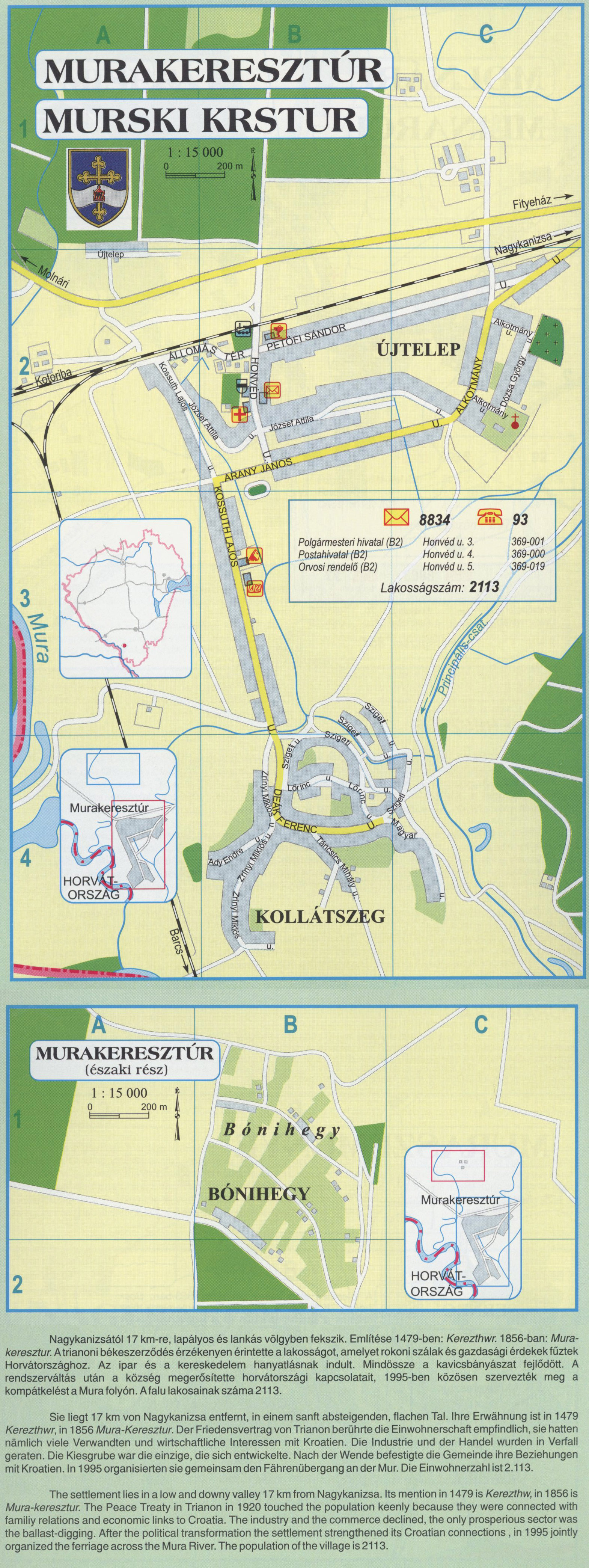 Nyilvános 2079 | 8214 | MURAKERESZTÚR | Nagykanizsától 17 km-re, lapályos és lankás völgyben fekszik. Említése 1479-ben: Kerezthwr. 1856-ban: Mura-keresztur. A trianoni békeszerződés érzékenyen érintette a lakosságot, amelyet rokoni szálak és gazdasági érdekek fűztek Horvátországhoz. Az ipar és a kereskedelem hanyatlásnak indult. Mindössze a kavicsbányászat fejlődött. A rendszerváltás után a község megerősítette horvátországi kapcsolatait, 1995-ben közösen szervezték meg a kompátkelést a Mura folyón. A falu lakosainak száma 2113. Sie liegt 17 km von Nagykanizsa entfernt, in einem sanft absteigenden, flachen Tal. Ihre Erwähnung ist in 1479 Kerezthwr, in 1856 Mura-Keresztur. Der Friedensvertrag von Trianon berührte die Einwohnerschaft empfindlich, sie hatten nämlich viele Verwandten und wirtschaftliche Interessen mit Kroatien. Die Industrie und der Handel wurden in Verfall geraten. Die Kiesgrube war die einzige, die sich entwickelte. Nach der Wende befestigte die Gemeinde ihre Beziehungen mit Kroatien. In 1995 organisierten sie gemeinsam den Fährenübergang an der Mur. Die Einwohnerzahl ist2.113. The settlement lies in a low and downy valley 17 km from Nagykanizsa. Its mention in 1479 is Kerezthw, in 1856 is Mura-keresztur. The Peace Treaty in Trianon in 1920 touched the population keenly because they were connected with familiy relations and economic links to Croatia. The industry and the commerce declined, the only prosperious sector was the ballast-digging. After the political transformation the settlement strengthened its Croatian connections , in 1995 jointly organized the ferriage across the Mura River. The population of the village is 2113. A részlet a következő kiadványból származik/Die Teile stammen vom volgenden Buch/This text came from the following book: Cím/Titel/Title: Zala megye településeinek atlasza - 257 település részletes térképe/Atlas der Komitat Zala - 257 Detailte Siedlungskarten/Zala county\'s Atlas - 257 settlement maps. Közreműködő/contributor: Lackner László (1943) (fotó) Kiadás/Ausgabe/Publisher: Gyula : HISZI-MAP, 1997 Sorozat/Serie/Series: Indulástól - megérkezésig... ETO: 912(439.121-2) ; 908.439.121 Cutter: Z 19 ISBN: 963-610-025-4 Oldalszám/Seiten/Pages: 323, 81 p. Megjegyzés/Note: Lezárva/Abgeschlossen am/Closed am: 1997. máj. 30. |