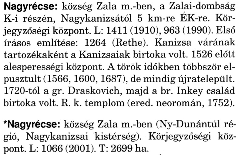 Nyilvános 2460 | 6378 | A szócikkek felismertetett szövege: | (A csillag után a kiegészítő kötetből származó szöveg következik) Nagyrécse: község Zala m.-ben, a Zalai-dombság K-i részén, Nagykanizsától 5 km-re ÉK-re. Körjegyzőségi központ. L: 1411 (1910), 963 (1990). Első írásos említése: 1264 (Rethe). Kanizsa várának tartozékaként a Kanizsaiak birtoka volt. 1526 előtt alesperességi központ. A török időkben többször elpusztult (1566, 1600, 1687), de mindig újratelepült. 1720-tól a gr. Draskovich, majd a br. Inkey család birtoka volt. R. k. templom (ered. neoromán, 1752). *Nagyrécse: község Zala m.-ben (Ny-Dunántúl régió, Nagykanizsai kistérség). Körjegyzőségi központ. L: 1066 (2001). T: 2699 ha. A szócikkek a következő lexikonból származnak: Cím: Magyar nagylexikon Közreműködő: Élesztős László (1949) (szerk.) ; Barabás Éva (1943) (szerk.) ; Berényi Gábor (1946) (szerk.) ; Bárány Lászlóné (szerk.) ; Adelmann-né Kertész Judit (1945) (közrem.) ; Froemel Károlyné Jáky Éva (1936) (közrem.) ; Akadémiai Kiadó és Nyomda Vállala Szerz. közl.: [... Élesztős László főszerk.] ; [szerk. Barabás Éva et al.] ; [bibliogr. Adelmanné Kertész Judit] ; [kész. az Akadémiai Kiadó Magyar Nagylexikon Szerkesztőségében] Kiadás: Budapest : Akad. K., 1993- Kötetei: 1. köt., A - Anc 2. köt., And - Bag 3. köt., Bah - Bij 4. köt., Bik - Bz 5. köt., C - Csem 6. köt., Csen - Ec 7. köt., Ed - Fe 8. köt., Ff - Gyep 9. köt., Gyer - Iq 10. köt., Ir - Kip 11. köt., Kir - Lem 12. köt., Len - Mep 13. köt., Mer - Nyk 14. köt., Nyl - Pom 15. köt., Pon - Sek 16. köt., Sel - Szö 17. köt., Szp - Ung 18. köt., Unh - Z 19. köt., Kiegészítő kötet, A - Z ETO jelzet: 030=945.11 Szakjelzet: 030 Cutter: M 14 ISBN: 963-05-6611-7 [!ISBN 963-05-6615-X] Nyelv: magyar Megjegyzés: Az 5. kötettől kiad. a Magyar Nagylexikon Kiadó ; A 6. kötettől főszerk. Berényi Gábor ; A 6. kötettől szakszerk. Bárány Lászlóné et al. ; A 6. kötettől bibliogr. Froemel Károlyné ; Bibliogr. a szócikkek végén |