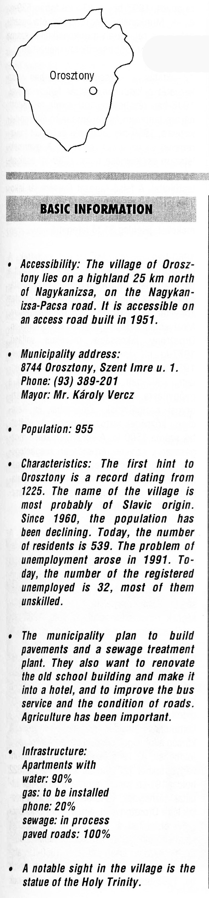 Nyilvános 2736 | 15529 | Orosztony | BASIC INFORMATION Accessibility: The village of Orosztony lies on a highland 25 km north of Nagykanizsa, on the Nagykanizsa-Pacsa road. It is accessible on an access road built in 1951. Municipality address: 8744 Orosztony, Szent Imre u. 1. Phone: (93) 389-201 Mayor: Mr. Károly Vercz Population: 955 Characteristics: The first hint to Orosztony is a record dating from 1225. The name of the village is most probably of Slavic origin. Since 1960, the population has been declining. Today, the number ot residents is 539. The problem of unemployment arose in 1991. Today, the number of the registered unemployed is 32, most of them unskilled. The municipality plan to build pavements and a sewage treatment plant. They also want to renovate the old school building and make it into a hotel, and to improve the bus service and the condition of roads. Agriculture has been important. Infrastructure: Apartments with water: 90% gas: to be installed phone: 20% sewage: in process paved roads: 100% A notable sight in the village is the statue of the Holy Trinity. This text came from the following book: Title: Handbook of Zala county (Zala megye kézikönyve) Series: County handbooks of Hungary (Magyarország megyei kézikönyvei) Chief editor: Hóbor József Publisher: (Hatvan), CEBA-Hungary Ltd, 1998 ETO: 908.439.121(035) ; 050.8(439.121) ISBN: 963-9089-18-2 Pages: 488-1040 p. Remark: Closed on: 1998. márc. 31. |