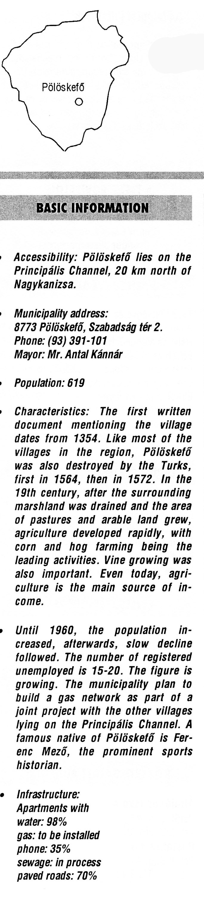 Nyilvános 2472 | 6462 | Pölöskefő | BASIC INFORMATION Accessibility: Pölöskefő lies on the Principális Channel, 20 km north of Nagykanizsa. Municipality address: 8773 Pölöskefő, Szabadság tér 2. Phone: (93) 391-101 Mayor: Mr. Antal Kánnár Population: 619 Characteristics: The first written document mentioning the village dates from 1354. Like most of the villages in the region, Pölöskefő was also destroyed by the Turks, first in 1564, then in 1572. In the 19th century, after the surrounding marshland was drained and the area of pastures and arable land grew, agriculture developed rapidly, with corn and hog farming being the leading activities. Vine growing was also important. Even today, agriculture is the main source of income. Until 1960, the population increased, afterwards, slow decline followed. The number of registered unemployed is 15-20. The figure is growing. The municipality plan to build a gas network as part of a joint project with the other villages lying on the Principális Channel. A famous native of Pölöskefő is Ferenc Mező, the prominent sports historian. Infrastructure: Apartments with water: 98% gas: to be installed phone: 35% sewage: in process paved roads: 70% This text came from the following book: Title: Handbook of Zala county (Zala megye kézikönyve) Series: County handbooks of Hungary (Magyarország megyei kézikönyvei) Chief editor: Hóbor József Publisher: (Hatvan), CEBA-Hungary Ltd, 1998 ETO: 908.439.121(035) ; 050.8(439.121) ISBN: 963-9089-18-2 Pages: 488-1040 p. Remark: Closed on: 1998. márc. 31. |