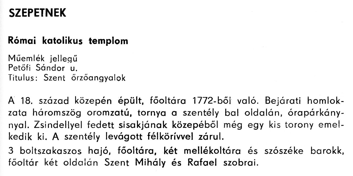 Nyilvános 1839 | 3519 | Szepetnek - Zala megye műemlékei 1979 103old | A részlet szövege: SZEPETNEK Római katolikus templom Műemlék jellegű Petőfi Sándor u. Titulus: Szent őrzőangyalok A 18. század közepén épült, főoltára 1772-ből való. Bejárati homlokzata háromszög oromzatú, tornya a szentély bal oldalán, órapárkánnyal. Zsindellyel fedett sisakjának közepéből még egy kis torony emelkedik ki. A szentély levágott félkörívvel zárul. 3 boltszakaszos hajó, főoltára, két mellékoltára és szószéke barokk, főoltár két oldalán Szent Mihály és Rafael szobrai. A részlet a következő könyvből származik: Cím: Zala megye műemlékei Szerző: Németh József (1928) Közreműködő: Vándor László (szerk.) ; Szabóky Zsolt (1941) (fotó) Szerz. közl.: Németh József ; [szerk. Vándor László] ; [fotók... Szabóky Zsolt] Kiadás jelzés: 2. bőv. kiad. Kiadás: Zalaegerszeg : Zalai Ny., 1979 ETO jelzet: 72(439.121) ; 7.025.3/.4(439.121) ; 908.439.121 Tárgyszó: Zala Szakjelzet: 908 Cutter: N 53 Nyelv: magyar Oldalszám: 134 p. |