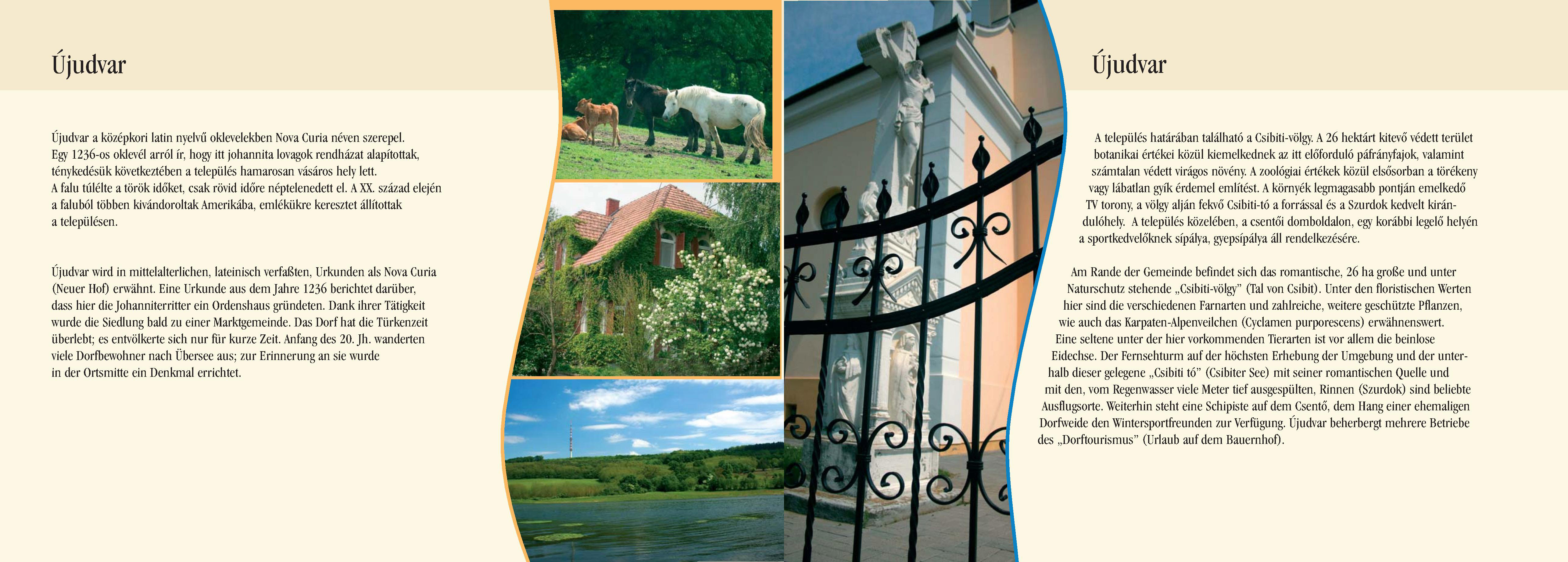 Nyilvános 2338 | 8037 | Újudvar | Újudvar wird in mittelalterlichen, lateinisch verfaßten, Urkunden als Nova Curia (Neuer Hof) erwähnt. Eine Urkunde aus dem Jahre 1236 berichtet darüber, dass hier die Johanniterritter ein Ordenshaus gründeten. Dank ihrer Tätigkeit wurde die Siedlung bald zu einer Marktgemeinde. Das Dorf hat die Türkenzeit überlebt; es entvölkerte sich nur für kurze Zeit. Anfang des 20. Jh. wanderten viele Dorfbewohner nach Übersee aus; zur Erinnerung an sie wurde in der Ortsmitte ein Denkmal errichtet. Am Rande der Gemeinde befindet sich das romantische, 26 ha große und unter Naturschutz stehende ,,Csibiti-völgy" (Tal von Csibit). Unter den floristischen Werten hier sind die verschiedenen Farnarten und zahlreiche, weitere geschützte Pflanzen, wie auch das Karpaten-Alpenveilchen (Cyclamen purporescens) erwähnenswert. Eine seltene unter der hier vorkommenden Tierarten ist vor allem die beinlose Eidechse. Der Fernsehturm auf der höchsten Erhebung der Umgebung und der unterhalb dieser gelegene ,,Csibiti tó" (Csibiter See) mit seiner romantischen Quelle und mit den, vom Regenwasser viele Meter tief ausgespülten, Rinnen (Szurdok) sind beliebte Ausflugsorte. Weiterhin steht eine Schipiste auf dem Csentő, dem Hang einer ehemaligen Dorfweide den Wintersportfreunden zur Verfügung. Újudvar beherbergt mehrere Betriebe des ,,Dorftourismus" (Urlaub auf dem Bauernhof). Dieses Text stammt von: Pannonhát tájpark prospektus 2006. Web: http://www.pannonhat.hu/ (auch in Deutsch) |