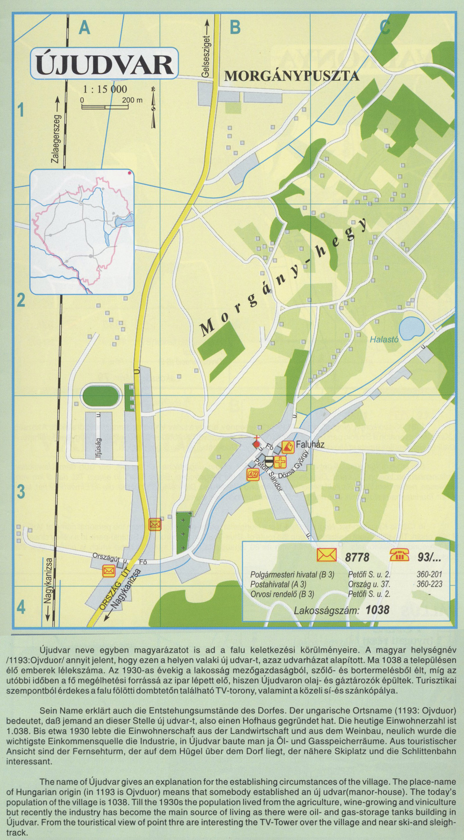Nyilvános 2272 | 5888 | Rövid leírás | Teljes leírás (2.5 KB) | ÚJUDVAR Újudvar neve egyben magyarázatot is ad a falu keletkezési körülményeire. A magyar helységnév /1193:Ojvduor/ annyit jelent, hogy ezen a helyen valaki új udvar-t, azaz udvarházat alapított. Ma 1038 a településen élő emberek lélekszáma. Az 1930-as évekig a lakosság mezőgazdaságból, szőlő- és bortermelésből élt, míg az utóbbi időben a fő megélhetési forrássá az ipar lépett elő, hiszen Újudvaron olaj- és gáztározók épültek. Turisztikai szempontból érdekes a falu fölötti dombtetőn található TV-torony, valamint a közeli sí-és szánkópálya. Sein Name erklärt auch die Entstehungsumstände des Dorfes. Der ungarische Ortsname (1193: Ojvduor) bedeutet, daß jemand an dieser Stelle új udvar-t, also einen Hofhaus gegründet hat. Die heutige Einwohnerzahl ist 1.038. Bis etwa 1930 lebte die Einwohnerschaft aus der Landwirtschaft und aus dem Weinbau, neulich wurde die wichtigste Einkommensquelle die Industrie, in Újudvar baute man ja Öl- und Gasspeicherräume. Aus touristischer Ansicht sind der Fernsehturm, der auf dem Hügel über dem Dorf liegt, der nähere Skiplatz und die Schlittenbahn interessant. The name of Újudvar gives an explanation for the establishing circumstances of the village. The place-name of Hungarian origin (in 1193 is Ojvduor) means that somebody established an új udvar(manor-house). The today\'s population of the village is 1038. Till the 1930s the population lived from the agriculture, wine-growing and viniculture but recently the industry has become the main source of living as there were oil- and gas-storage tanks building in Újudvar. From the touristical view of point thre are interesting the TV-Tower over the village and near ski-and sleigh-track. A részlet a következő kiadványból származik/Die Teile stammen vom volgenden Buch/This text came from the following book: Cím/Titel/Title: Zala megye településeinek atlasza - 257 település részletes térképe/Atlas der Komitat Zala - 257 Detailte Siedlungskarten/Zala county\'s Atlas - 257 settlement maps. Közreműködő/contributor: Lackner László (1943) (fotó) Kiadás/Ausgabe/Publisher: Gyula : HISZI-MAP, 1997 Sorozat/Serie/Series: Indulástól - megérkezésig... ETO: 912(439.121-2) ; 908.439.121 Cutter: Z 19 ISBN: 963-610-025-4 Oldalszám/Seiten/Pages: 323, 81 p. Megjegyzés/Note: Lezárva/Abgeschlossen am/Closed am: 1997. máj. 30. |