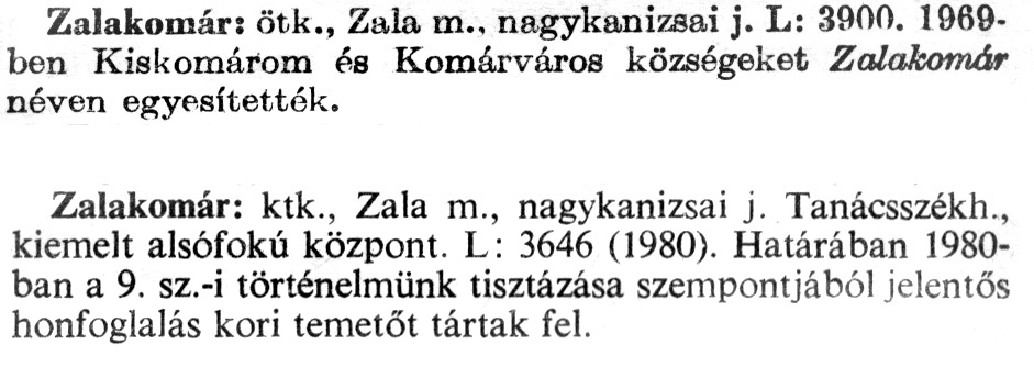 Nyilvános 1981 | 5436 | A szócikkek felismertetett szövege: | (A második szócikk az 1981-es kiadású kiegészítő kötetből származik) Zalakomár: ötk., Zala m., nagykanizsai j. L: 3900. 1969-ben Kiskomárom és Komárváros községeket Zalakomár néven egyesítették. Zalakomár: ktk., Zala m., nagykanizsai j. Tanácsszékh., kiemelt alsófokú központ. L: 3646 (1980). Határában 1980-ban a 9. sz.-i történelmünk tisztázása szempontjából jelentős honfoglalás kori temetőt tártak fel. A szócikkek a következő lexikonból származnak: Cím: Új magyar lexikon Közreműködő: Berei Andor (1900-1979) (szerk.) Szerz. közl.: [szerk. Berei Andor et al.] Kiadás jelzés: 2. lny. Kiadás: Budapest : Akad. K., 1961-1962 Kötetei: 1., A - C 2., D - F 3., G - J 4., K - Me 5., Mf - R 6., S - Z 7. köt., A-Z Kiegészítő kötet (1972) Kiegészítő kötet, 1962÷1980 (1981) ETO jelzet: 03=945.11 Szakjelzet: 030 Cutter: U 28 Nyelv: magyar Megjegyzés: Bibliogr. a címszavak egy részének végén |