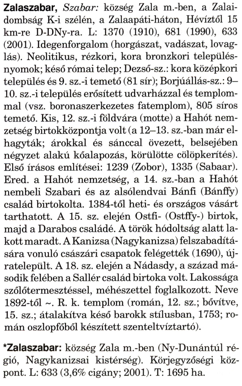 Nyilvános 2367 | 6001 | Rövid leírás | Teljes leírás (3.32 KB) | A szócikkek felismertetett szövege: (A csillag után a kiegészítő kötetből származó szöveg következik) Zalaszabar, Szabar: község Zala m.-ben, a Zalai-dombság K-i szélén, a Zalaapáti-háton, Hévíztől 15 km-re D-DNy-ra. L: 1370 (1910), 681 (1990), 633 (2001). Idegenforgalom (horgászat, vadászat, lovaglás). Neolitikus, rézkori, kora bronzkori településnyomok; késő római telep; Dezső-sz.: kora középkori település és 9. sz.-i temető (81 sír); Borjúállás-sz.: 9— 10. sz.-i település erősített udvarházzal és templommal (vsz. boronaszerkezetes fatemplom), 805 síros temető. Kis, 12. sz.-i földvára (motte) a Hahót nemzetség birtokközpontja volt (a 12—13. sz.-ban már elhagyták; árokkal és sánccal övezett, belsejében négyzet alakú kőalapozás, körülötte cölöpkerítés). Első írásos említései: 1239 (Zobor), 1335 (Sabaar). Ered. a Hahót nemzetség, a 14. sz.-ban a Hahót nembeli Szabari és az alsólendvai Bánfi (Bánffy) család birtokolta. 1384-től heti- és országos vásárt tarthatott. A 15. sz. elején Ostfi- (Ostffy-) birtok, majd a Darabos családé. A török hódoltság alatt lakott maradt. A Kanizsa (Nagykanizsa) felszabadítására vonuló császári csapatok felégették (1690), újratelepült. A 18. sz. elején a Nádasdy, a század második felében a Sallér család birtoka volt. Lakossága szőlőtermesztéssel, méhészettel foglalkozott. Neve 1892-től ~. R. k. templom (román, 12. sz.; bővítve, 15. sz.; átalakítva késő barokk stílusban, 1753; román oszlopfőből készített szenteltvíztartó). *Zalaszabar: község Zala m.-ben (Ny-Dunántúl régió, Nagykanizsai kistérség). Körjegyzőségi központ. L: 633 (3,6% cigány; 2001). T: 1695 ha. A szócikkek a következő lexikonból származnak: Cím: Magyar nagylexikon Közreműködő: Élesztős László (1949) (szerk.) ; Barabás Éva (1943) (szerk.) ; Berényi Gábor (1946) (szerk.) ; Bárány Lászlóné (szerk.) ; Adelmann-né Kertész Judit (1945) (közrem.) ; Froemel Károlyné Jáky Éva (1936) (közrem.) ; Akadémiai Kiadó és Nyomda Vállala Szerz. közl.: [... Élesztős László főszerk.] ; [szerk. Barabás Éva et al.] ; [bibliogr. Adelmanné Kertész Judit] ; [kész. az Akadémiai Kiadó Magyar Nagylexikon Szerkesztőségében] Kiadás: Budapest : Akad. K., 1993- Kötetei: 1. köt., A - Anc 2. köt., And - Bag 3. köt., Bah - Bij 4. köt., Bik - Bz 5. köt., C - Csem 6. köt., Csen - Ec 7. köt., Ed - Fe 8. köt., Ff - Gyep 9. köt., Gyer - Iq 10. köt., Ir - Kip 11. köt., Kir - Lem 12. köt., Len - Mep 13. köt., Mer - Nyk 14. köt., Nyl - Pom 15. köt., Pon - Sek 16. köt., Sel - Szö 17. köt., Szp - Ung 18. köt., Unh - Z 19. köt., Kiegészítő kötet, A - Z ETO jelzet: 030=945.11 Szakjelzet: 030 Cutter: M 14 ISBN: 963-05-6611-7 [!ISBN 963-05-6615-X] Nyelv: magyar Megjegyzés: Az 5. kötettől kiad. a Magyar Nagylexikon Kiadó ; A 6. kötettől főszerk. Berényi Gábor ; A 6. kötettől szakszerk. Bárány Lászlóné et al. ; A 6. kötettől bibliogr. Froemel Károlyné ; Bibliogr. a szócikkek végén |
