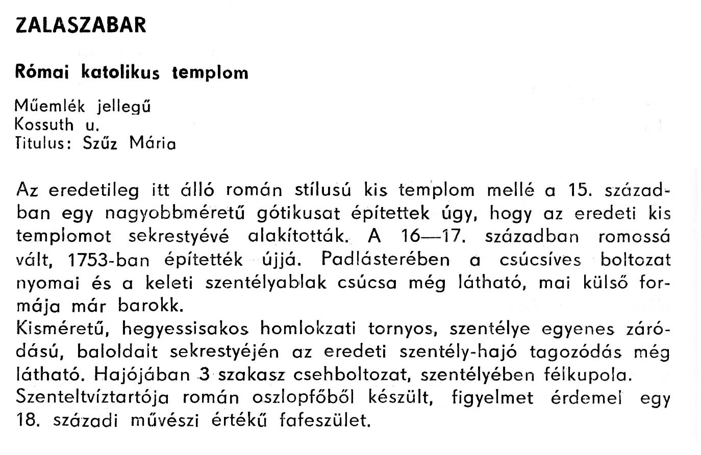 Nyilvános 2223 | 5725 | Zalaszabar - Zala megye műemlékei 1979 119-120old | A részlet szövege: ZALASZABAR Római katolikus templom Műemlék jellegű Kossuth u. Titulus: Szűz Mária Az eredetileg itt álló román stílusú kis templom mellé a 15. században egy nagyobbméretű gótikusat építettek úgy, hogy az eredeti kis templomot sekrestyévé alakították. A 16–17. században romossá vált, 1753-ban építették újjá. Padlásterében a csúcsíves boltozat nyomai és a keleti szentélyablak csúcsa még látható, mai külső formája már barokk. Kisméretű, hegyessisakos homlokzati tornyos, szentélye egyenes záródású, baloldalt sekrestyéjén az eredeti szentély-hajó tagozódás még látható. Hajójában 3 szakasz csehboltozat, szentélyében félkupola. Szenteltvíztartója román oszlopfőből készült, figyelmet érdemel egy 18. századi művészi értékű fafeszület. A részlet a következő könyvből származik: Cím: Zala megye műemlékei Szerző: Németh József (1928) Közreműködő: Vándor László (szerk.) ; Szabóky Zsolt (1941) (fotó) Szerz. közl.: Németh József ; [szerk. Vándor László] ; [fotók... Szabóky Zsolt] Kiadás jelzés: 2. bőv. kiad. Kiadás: Zalaegerszeg : Zalai Ny., 1979 ETO jelzet: 72(439.121) ; 7.025.3/.4(439.121) ; 908.439.121 Tárgyszó: Zala Szakjelzet: 908 Cutter: N 53 Nyelv: magyar Oldalszám: 134 p. |