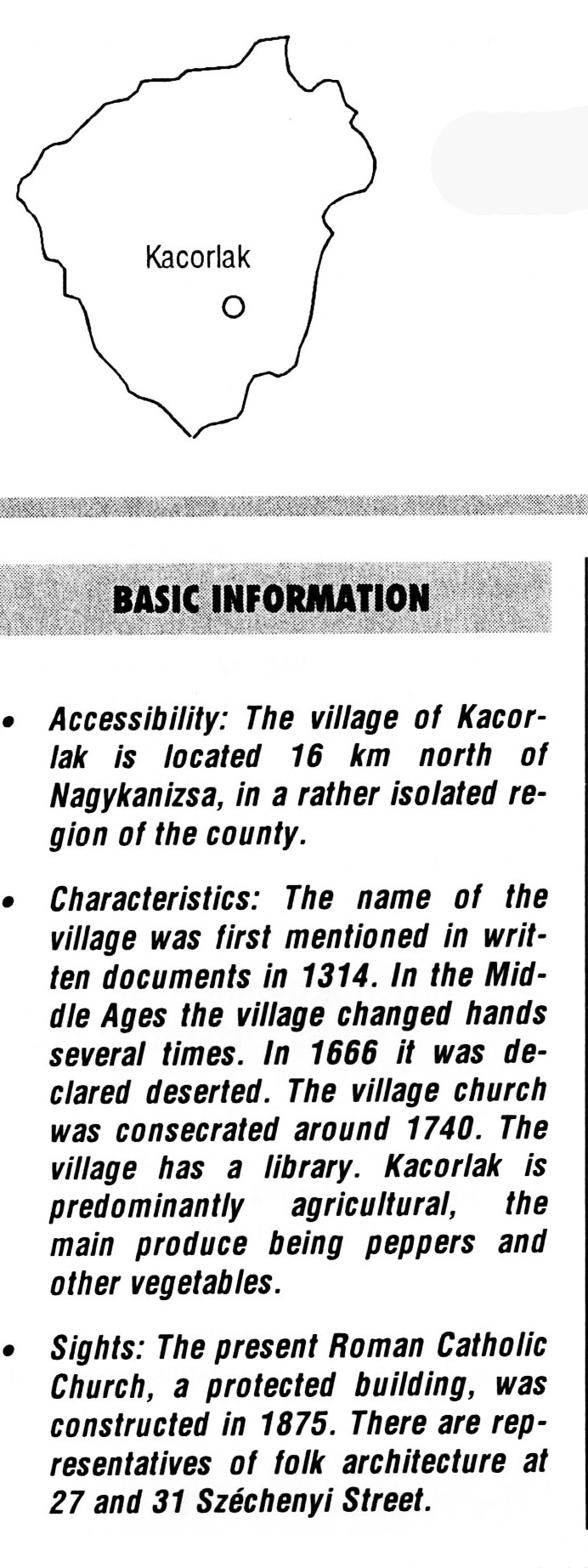 Nyilvános 2538 | 7250 | Kacorlak | BASIC INFORMATION Accessibility: The village of Kacorlak is located 16 km north of Nagykanizsa, in a rather isolated region of the county. Characteristics: The name of the village was first mentioned in written documents in 1314. In the Middle Ages the village changed hands several times. In 1666 it was declared deserted. The village church was consecrated around 1740. The village has a library. Kacorlak is predominantly agricultural, the main produce being peppers and other vegetables. Sights: The present Roman Catholic Church, a protected building, was constructed in 1875. There are representatives of folk architecture at 27 and 31 Széchenyi Street. This text came from the following book: Title: Handbook of Zala county (Zala megye kézikönyve) Series: County handbooks of Hungary (Magyarország megyei kézikönyvei) Chief editor: Hóbor József Publisher: (Hatvan), CEBA-Hungary Ltd, 1998 ETO: 908.439.121(035) ; 050.8(439.121) ISBN: 963-9089-18-2 Pages: 488-1040 p. Remark: Closed on: 1998. márc. 31. |