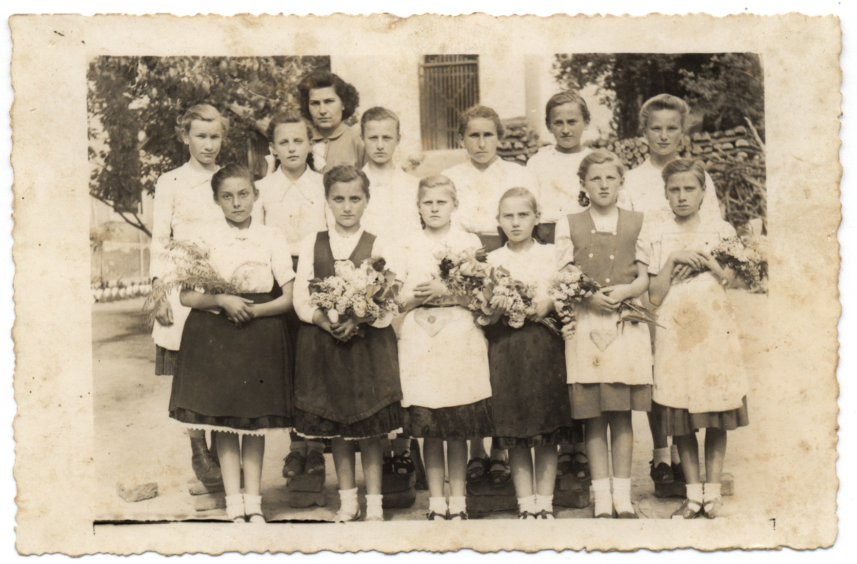 Nyilvános 1615 | 2575 | Anyák napja 1955. május | A képen: Herczegh Rózsa, Bekő Zsuzsanna, a hátul lévő tanár neve nem ismert, Könczöl Margit, Anda Eszter, Márfi Margit, Halász Mária, Deli Erzsébet, Csináth Erzsébet, Csuha Piroska, Morton Anna, Kocsis Ilona, Molnár Margit. |