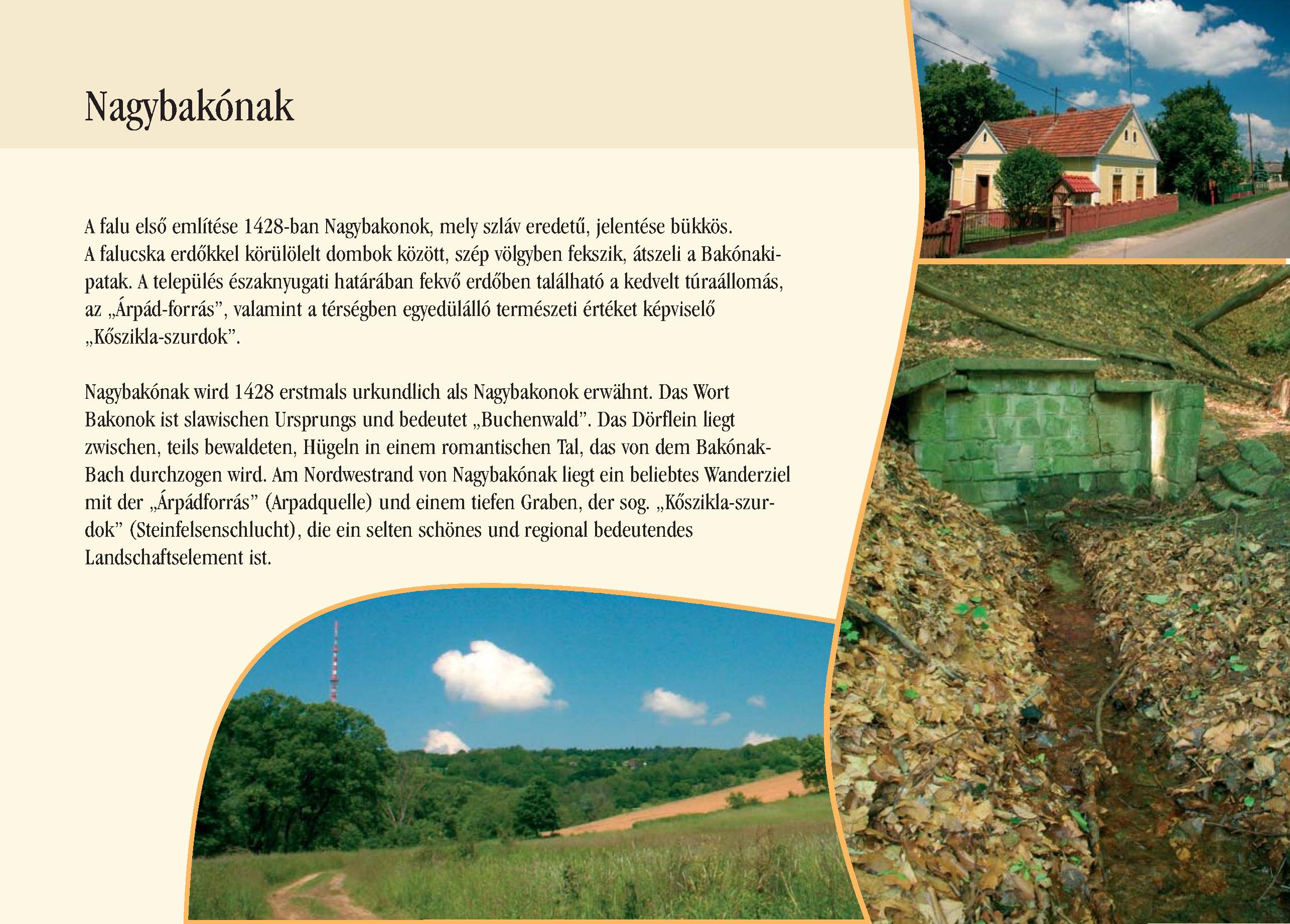Nyilvános 2752 | 9979 | Nagybakónak | Nagybakónak wird 1428 erstmals urkundlich als Nagybakonok erwähnt. Das Wort Bakonok ist slawischen Ursprungs und bedeutet ,,Buchenwald". Das Dörflein liegt zwischen, teils bewaldeten, Hügeln in einem romantischen Tal, das von dem Bakónak-Bach durchzogen wird. Am Nordwestrand von Nagybakónak liegt ein beliebtes Wanderziel mit der ,,Árpádforrás" (Arpadquelle) und einem tiefen Graben, der sog. ,,Kőszikla-szurdok" (Steinfelsenschlucht), die ein selten schönes und regional bedeutendes Landschaftselement ist. Dieses Text stammt von: Pannonhát tájpark prospektus 2006. Web: http://www.pannonhat.hu/ (auch in Deutsch) |