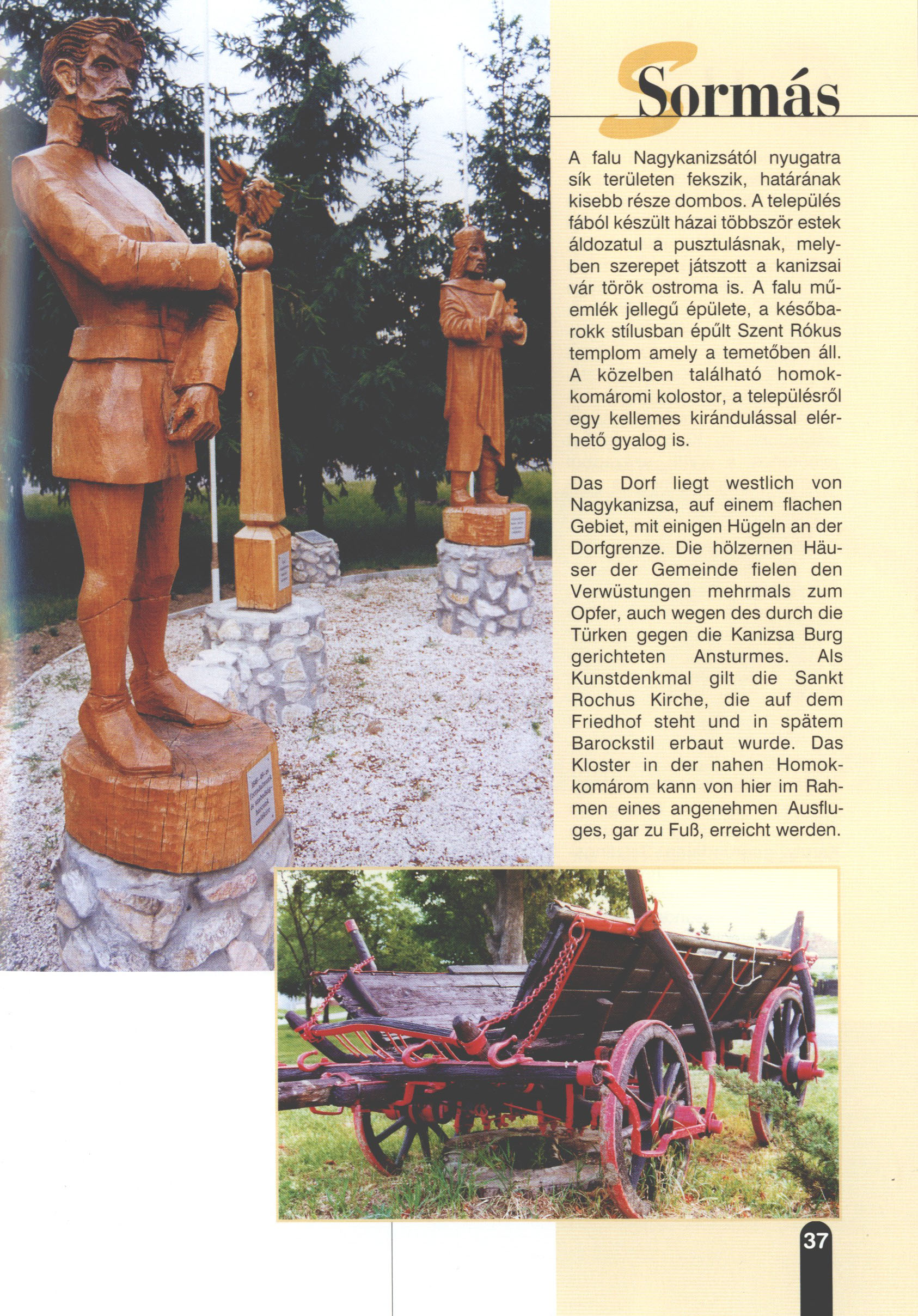 Nyilvános 2441 | 8140 | Sormás | Das Dorf liegt westlich von Nagykanizsa, auf einem flachen Gebiet, mit einigen Hügeln an der Dorfgrenze. Die hölzernen Häuser der Gemeinde fielen den Verwüstungen mehrmals zum Opfer, auch wegen des durch die Türken gegen die Kanizsa Burg gerichteten Ansturmes. Als Kunstdenkmal gilt die Sankt Rochus Kirche, die auf dem Friedhof steht und in spätem Barockstil erbaut wurde. Das Kloster in der nahen Homokkomárom kann von hier im Rahmen eines angenehmen Ausfluges, gar zu Fuß, erreicht werden. Dieses Text stammt von: Titel: Hívogató a Régiók Kapujában - Útikönyv Látnivalók Nagykanizsán és Térségében (Einladend in dem Tor des Gebiets - Reisebuch - Sehenswürdigkeiten in Nagykanizsa und Umgebung) Herausgegeben von: Nagykanizsa és a Környező Települések Területfejlesztési Társulása (Verein für Gebietsentwicklung in Nagykanizsa und in ihrer Umgebung) 8800 Nagykanizsa, Petőfi Sándor út 5. Tel.: 06 93/536-453 • 06 93/536-454 Tel ./Fax: 06 93/326-323 E-mail: terstars@axelero.hu www.kanizsaterseg.celodin.hu |