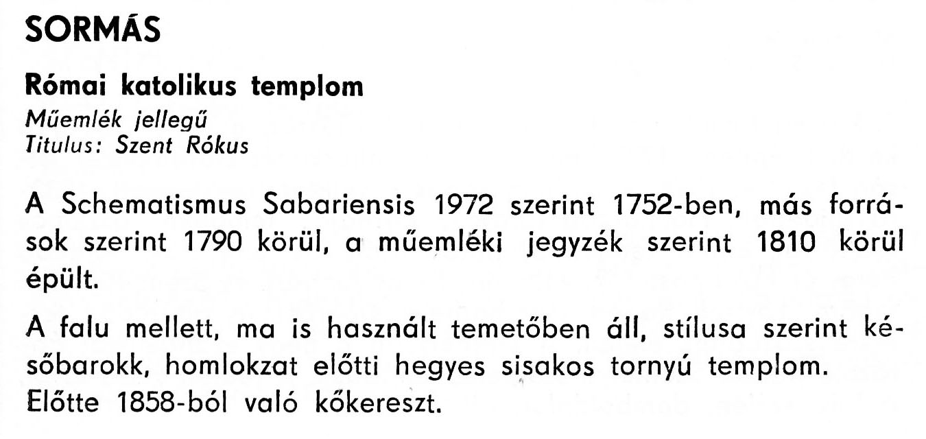Nyilvános 1925 | 3880 | Sormás - Zala megye műemlékei 1977 083old | A részlet szövege: SORMÁS Római katolikus templom Műemlék jellegű Titulus: Szent Rókus A Schematismus Sabariensis 1972 szerint 1752-ben, más források szerint 1790 körül, a műemléki jegyzék szerint 1810 körül épült. A falu mellett, ma is használt temetőben áll, stílusa szerint későbarokk, homlokzat előtti hegyes sisakos tornyú templom. Előtte 1858-ból való kőkereszt. A részlet a következő könyvből származik: Cím: Zala megye műemlékei Szerző: Németh József (1928) Közreműködő: Lantos Miklós (fotó) Szerz. közl.: Németh József ; [fotók... Lantos Miklós] Kiadás: Zalaegerszeg : Zalai Ny., 1977 ETO jelzet: 72(439.121) ; 7.025.3/.4 ; 908.439.121 Tárgyszó: Zala megye Szakjelzet: 908 Cutter: N 53 Nyelv: magyar Oldalszám: 109 p. |