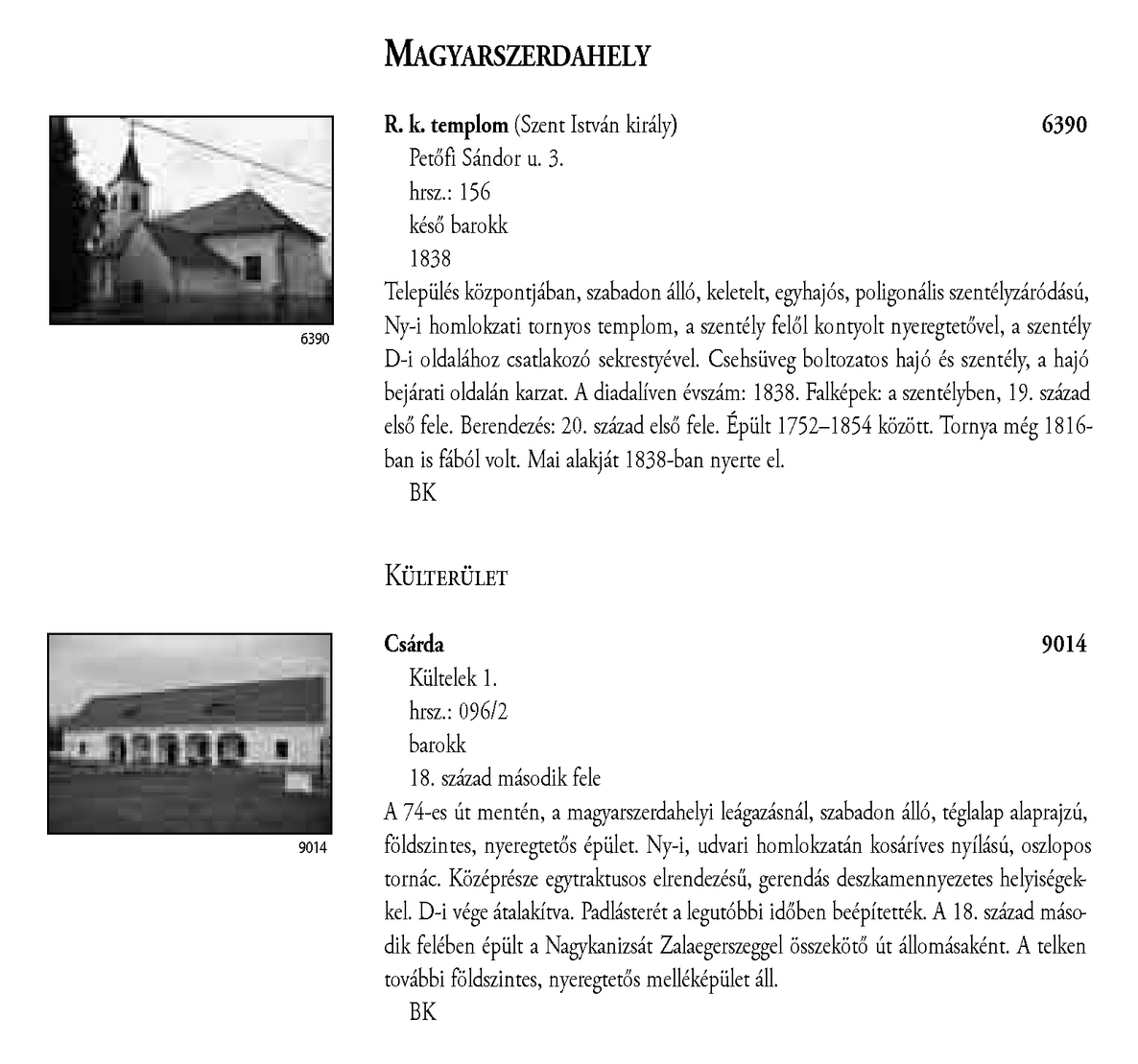 Nyilvános 2530 | 7421 | Magyarszerdahely - Magyarország műemlékjegyzéke - Zala megye 2006 068-069old | A részlet szövege: MAGYARSZERDAHELY R. k. templom (Szent István király) 6390 Petőfi Sándor u. 3. hrsz.: 156 késő barokk 1838 Település központjában, szabadon álló, keletelt, egyhajós, poligonális szentélyzáródású, Ny-i homlokzati tornyos templom, a szentély felől kontyolt nyeregtetővel, a szentély D-i oldalához csatlakozó sekrestyével. Csehsüveg boltozatos hajó és szentély, a hajó bejárati oldalán karzat. A diadalíven évszám: 1838. Falképek: a szentélyben, 19. század első fele. Berendezés: 20. század első fele. Épült 1752–1854 között. Tornya még 1816ban is fából volt. Mai alakját 1838-ban nyerte el. BK KÜLTERÜLET Csárda Kültelek 1. hrsz.: 096/2 barokk 18. század második fele 9014 A 74-es út mentén, a magyarszerdahelyi leágazásnál, szabadon álló, téglalap alaprajzú, földszintes, nyeregtetős épület. Ny-i, udvari homlokzatán kosáríves nyílású, oszlopos tornác. Középrésze egytraktusos elrendezésű, gerendás deszkamennyezetes helyiségekkel. D-i vége átalakítva. Padlásterét a legutóbbi időben beépítették. A 18. század második felében épült a Nagykanizsát Zalaegerszeggel összekötő út állomásaként. A telken további földszintes, nyeregtetős melléképület áll. BK A részlet a következő könyv online változatából származik: Cím: Magyarország műemlékjegyzéke Közreműködő: Haris Andrea. (szerk.) ; Kulturális Örökségvédelmi Hivatal (Budapest) (közread.) ; Somorjay Sélysette. (szerk.) ; Bardoly István (közrem.) Szerz. közl.: [sorozatszerk. Haris Andrea, Somorjay Sélysette] ; [mtárs Bardoly István] ; [közread. a] Kulturális Örökségvédelmi Hivatal. Kiadás: Budapest : KÖH, 2006 Kötetadat: Zala megye ISBN: 963-86510-7-5 ö ISBN: 963 7474 10 2 Nyelv: magyar A jegyzék a Kultúrális Örökségvédelmi Hivatal honlapján, a következő link alatt található: http://www.koh.hu/index.php?_mp=nyitolap&_amp=MUEML A fejléc adatairól 1. Objektum neve – törzsszám A fejléc első sora a műemlék eredeti rendeltetésének megfelelő nevet tartalmazza. Mögötte zárójelben templom esetében annak titulusa, más épületeknél indokolt esetben az eredeti rendeltetéstől eltérő, mai használatra utaló intézmény név (pl. városháza, múzeum, szálloda, oktatási intézmény hivatalos neve, stb.) olvasható. A törzsszám (trsz.) a műemlék egyetlen soha nem változó adata. A gyors azonosítás, illetve a törzsszám szerinti keresés lehetősége végett az objektummal egy sorban, a fejléc jobb szélén kiemelten jelenik meg. Összetartozó műemlék részek vagy történetileg egy együttest alkotó műemlékek sokszor külön törzsszámon lettek műemlékké nyilvánítva. Előfordulhat ezért, hogy egy fejléc alatt a leíró részben több, külön törzsszámmal rendelkező objektum szerepel. A törzsszámot ezekben az esetekben is az objektummal egy sorban tüntetjük fel. 2. Utca, házszám Egy utcán belül, amennyiben a számozás ezt lehetővé teszi, először a templomot adjuk meg, ezt követi a parókia, majd egyéb objektumok, pl. szobrok következnek. Házszám nélkül említünk egyes műemlékfajtákat (elsősorban templomokat), amennyiben a topográfiai azonosítás szempontjából a házszám közömbös vagy éppen zavaró. Előfordul, hogy a műemlék nem köthető nevesített közterülethez. Az ilyeneket a település végéhez soroltuk, és a leírásban kitértünk a településen belül elfoglalt helyükre. 3. Helyrajzi szám Ha egy helyrajzi számon és egy címen (pl. temetőben) több, külön törzsszámmal védett objektum van, akkor az együttesre utaló műemlék megnevezés alatt a közös adatokat egyszer adjuk meg. Ezt követően külön címszavanként következik a műemlékek leírása. Ilyen esetben az emlékeket mutatóztuk. Ezt az eljárást követtük, tekintet nélkül arra, hogy a teljes együttes védett-e vagy sem. (Védett együttes mellett mindig törzsszám szerepel.) Ha több helyrajzi szám is tartozik egy törzsszámhoz, akkor a fejlécben valamennyi számot feltüntettük. Amennyiben ilyen esetben több elemből álló műemlékről van szó, akkor a leíró részben minden külön említett elem után zárójelben megadjuk a vonatkozó helyrajzi számot. 4. Stílus A műemléket jelenleg meghatározó, domináns stílusjegy alapján került meghatározásra. Egyéb, érzékelhető stíluselemekre a leíró részben utalunk. 5. Datálás A műemléket jelenleg leginkább jellemző építési dátum. Korábbi építési periódusokra, illetve későbbi átépítésekre a történeti részben utalunk, fennmaradt részletek esetén lehetőség szerint azokra vonatkoztatva. A leírás A műemlékek leírása tartalmilag öt szakaszból áll, amely folyamatos szövegként jelenik meg. Az objektum topográfiai meghatározása a műemlék településen belüli vagy ahhoz viszonyított helyét adja meg, amennyiben ez az azonosításhoz nélkülözhetetlen, avagy azt segíti. Az emlék jellegének leírása utal a környezettel való kapcsolatra (tájolás, beépítés módja, környező terepviszonyok, amennyiben ezek jellemzőek), alaprajzi elrendezésre, tömegre és a jellegzetes homlokzati elemekre (pl. rizalitok, erkélyek, stb.). Részletes homlokzatleírás nem volt cél. Belső építészeti részletet csak akkor említünk meg, ha ez tartozékként jelentős, esetleg a datálás vagy a stílus meghatározás alapjául szolgált. Ezt követi az épület tartozékainak és berendezésének utalásszerű ismertetése (falfestés, üvegablak, berendezés), az adott elem után zárójelben az ismert mesterek nevével; az orgonát külön említjük, amennyiben hangszerként is műemléki értékkel bír. A mesternevekre, berendezésre történő utalás jelzésszerű, tételes információért 