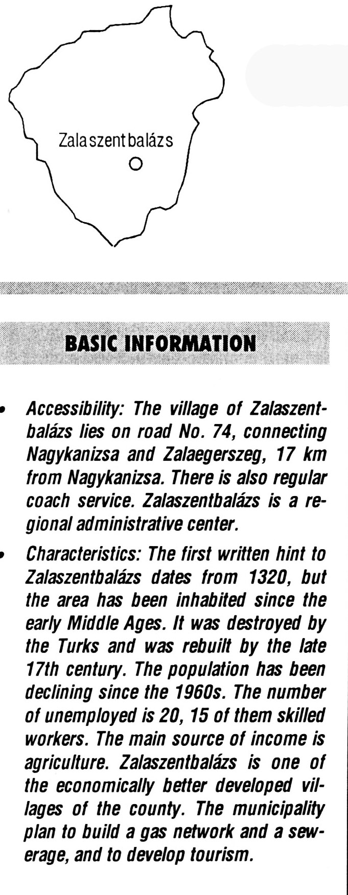 Nyilvános 2212 | 5998 | Zalaszentbalázs | BASIC INFORMATION Accessibility: The village of Zalaszentbalázs lies on road No. 74, connecting Nagykanizsa and Zalaegerszeg, 17 km from Nagykanizsa. There is also regular coach service. Zalaszentbalázs is a regional administrative center. Characteristics: The first written hint to Zalaszentbalázs dates from 1320, but the area has been inhabited since the early Middle Ages. It was destroyed by the Turks and was rebuilt by the late 17th century. The population has been declining since the 1960s. The number of unemployed is 20,15 of them skilled workers. The main source of income is agriculture. Zalaszentbalázs is one of the economically better developed villages of the county. The municipality plan to build a gas network and a sewerage, and to develop tourism. This text came from the following book: Title: Handbook of Zala county (Zala megye kézikönyve) Series: County handbooks of Hungary (Magyarország megyei kézikönyvei) Chief editor: Hóbor József Publisher: (Hatvan), CEBA-Hungary Ltd, 1998 ETO: 908.439.121(035) ; 050.8(439.121) ISBN: 963-9089-18-2 Pages: 488-1040 p. Remark: Closed on: 1998. márc. 31. |