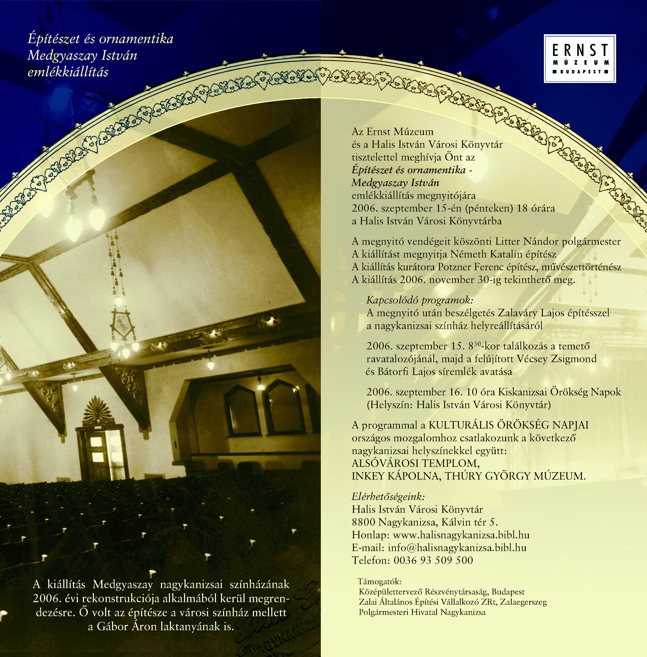 Nyilvános 2592 | 7028 | 2006 09 15 - Építészet és ornamentika - Medgyaszay István emlékkiállítás meghívó | A kiállítás megnyitója az eseménynaptárban is szerepel, a következő link alatt: http://www.nagykar.hu/esemenynaptar/1/488.html A program a Kultúrális Örökség Napjai programsorozat része. Kapcsolódó programok: Helytörténeti konferencia http://www.nagykar.hu/esemenynaptar/1/483.html a felújított Vécsey Zsigmond és Bátorfi Lajos síremlékek avatása http://www.nagykar.hu/esemenynaptar/1/489.html Az meghívó szövege: Építészet és ornamentika - Medgyaszay István emlékkiállítás A kiállítás Medgyaszay nagykanizsai színházának 2006. évi rekonstrukciója alkalmából kerül megrendezésre. Ő volt az építésze a városi színház mellett a Gábor Áron laktanyának is. Az Ernst Múzeum és a Halis István Városi Könyvtár tisztelettel meghívja Önt az Építészet és ornamentika- Medgyaszay István emlékkiállítás megnyitójára 2006. szeptember 15-én (pénteken) 18 órára a Halis István Városi Könyvtárba A megnyitó vendégeit köszönti Litter Nándor polgármester A kiállítást megnyitja Németh Katalin építész A kiállítás kurátora Potzner Ferenc építész, művészettörténész A kiállítás 2006. november 30-ig tekinthető meg. Kapcsolódó programok: A megnyitó után beszélgetés Zalaváry Lajos építésszel a nagykanizsai színház helyreállításáról 2006. szeptember 15. 830-kor találkozás a temető ravatalozójánál, majd a felújított Vécsey Zsigmond és Bátorfi Lajos síremlék avatása 2006. szeptember 16. 10 óra Kiskanizsai Örökség Napok (Helyszín: Halis István Városi Könyvtár) A programmal a KULTURÁLIS ÖRÖKSÉG NAPJAI országos mozgalomhoz csatlakozunk a következő nagykanizsai helyszínekkel együtt: ALSÓVÁROSI TEMPLOM, INKEY KÁPOLNA, THÚRY GYÖRGY MÚZEUM. Elérhetőségeink: Halis István Városi Könyvtár 8800 Nagykanizsa, Kálvin tér 5. Honlap: www.halisnagykanizsa.bibl.hu E-mail: info@halisnagykanizsa.bibl.hu Telefon: 0036 93 509 500 Támogatók: Középülettervező Részvénytársaság, Budapest Zalai Általános Építési Vállalkozó ZRt, Zalaegerszeg Polgármesteri Hivatal Nagykanizsa |