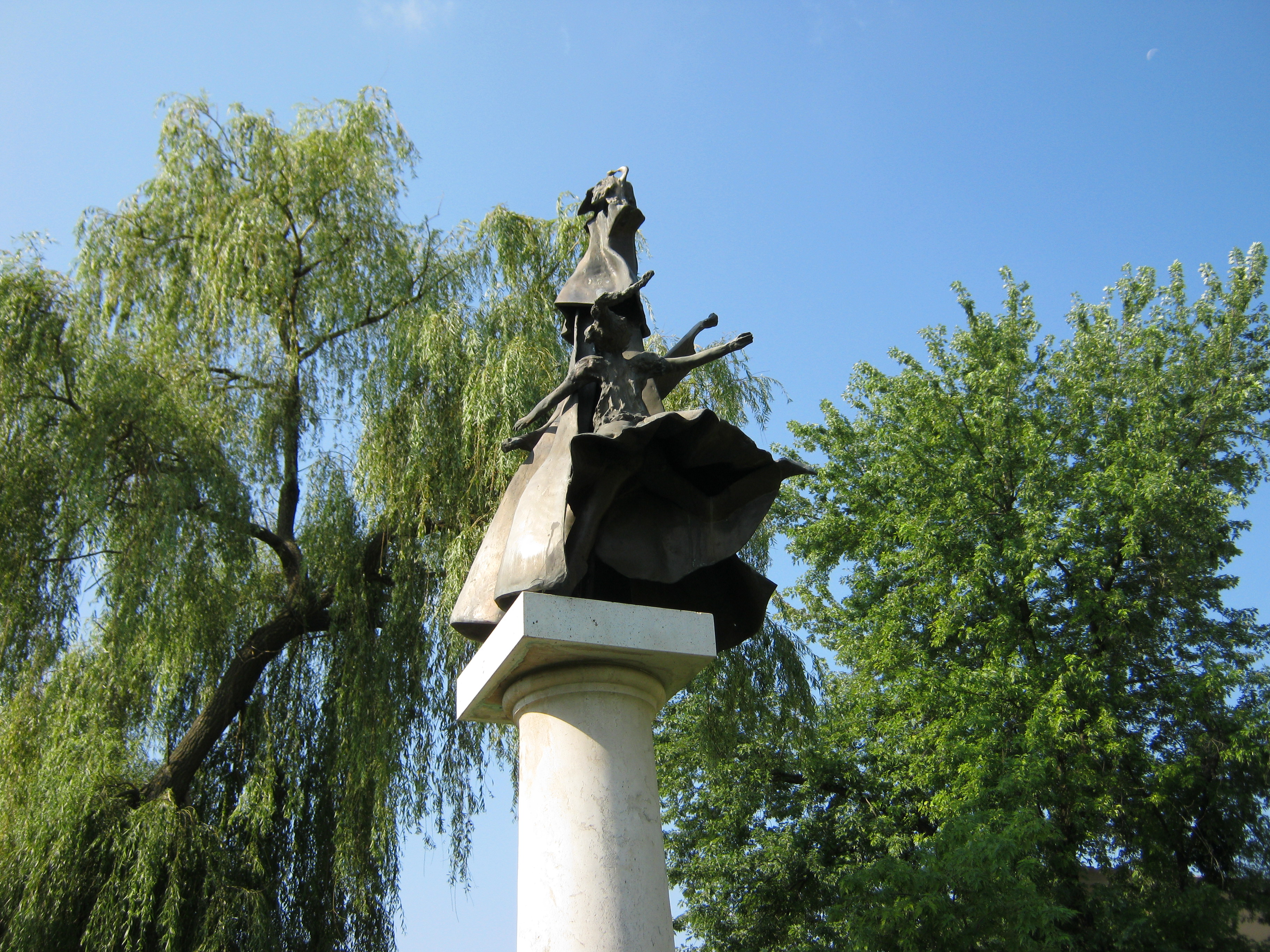 Nyilvános 1352 | 1810 | Nagykálló, Szabadság tér: A "Kállai kettős" emlékmű | A művelődési ház előtt 1994-ben állították fel Borbás Tibor: Kállai kettős című szoborkompozícióját. A helyi dalos és táncos hagyományon alapuló ún. „kállai kettős”-t Kodály Zoltán tette világhírűvé, aki a helyszínen (lásd: Nagykálló, Nagybalkányi út 1.) 1926-ban megismert táncot 1950-ben öntötte műzenei formába a Magyar Állami Népi Együttes számára. A zeneszerző emléktábláját a művelődési ház belső terében helyezték el. A híres tánc hagyománya máig él a településen. Ébrentartói a Kállai Kettős Néptáncklub, a Kállai Lakodalmas Hagyományőrző Csoport és a Kiskállai Ifjúsági Néptáncegyüttes. A művelődési ház a házigazdája a kétévente ősszel megrendezésre kerülő Kállai Kettős Néptáncfesztiválnak. Felh. irod.: Harsányi Gézáné: Kálló kincsei. Nagykálló, 2007 www.nagykallo.net A fénykép 2010 augusztus elején készült. |