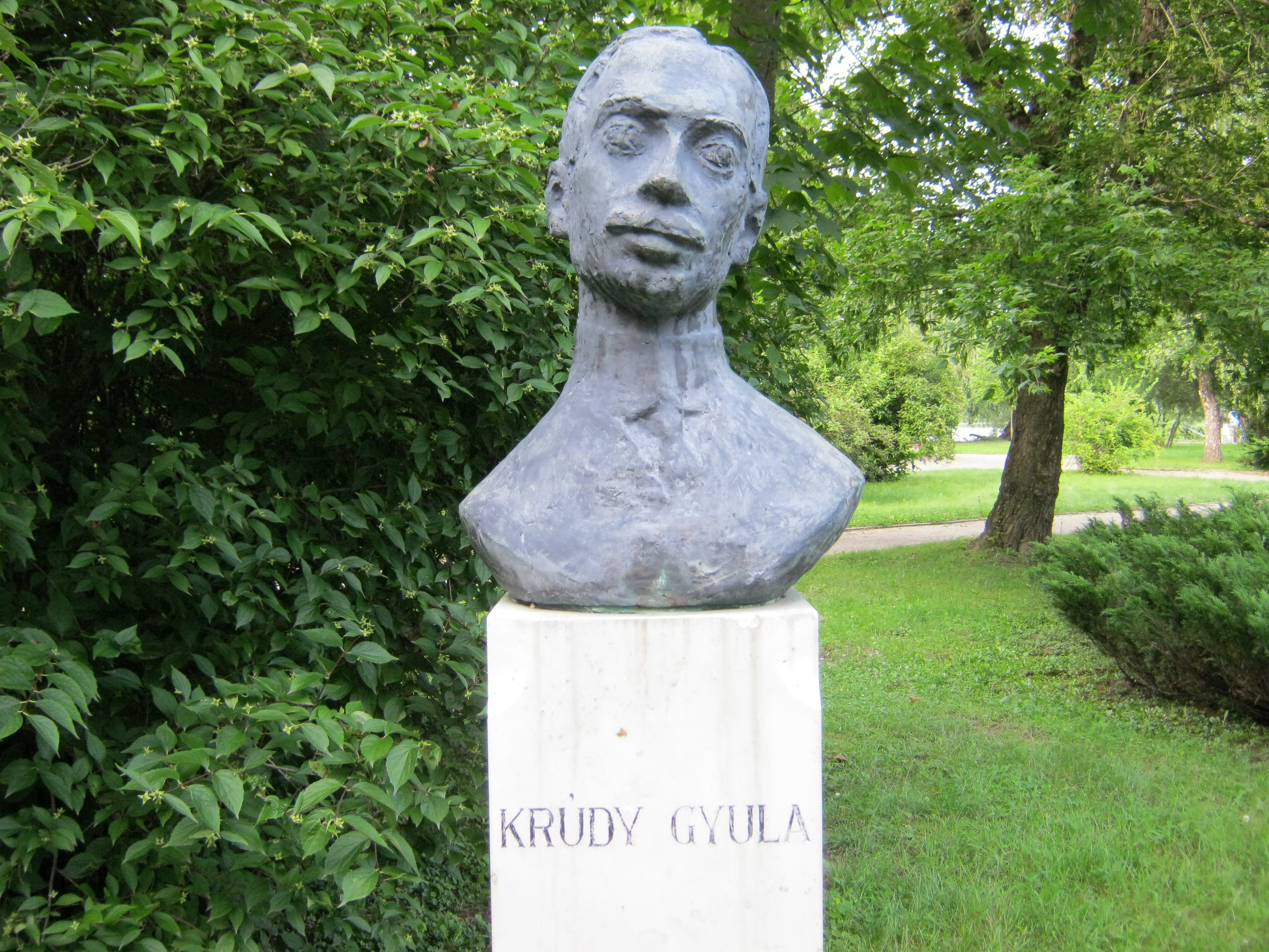 Nyilvános 1127 | 2983 | Nyíregyháza-Sóstó, Park: Krúdy Gyula szobra | Blaha Lujza szobra közelében áll Krúdy Gyula bronz mellszobra (Mészáros Dezső, 1973). A nyíregyházi születésű (lásd: Nyíregyháza, Szent István utca 8.) nagy magyar író jól ismerte Sóstófürdő életét, amelyet több írásában is megörökített. A fénykép 2010 augusztus elején készült |