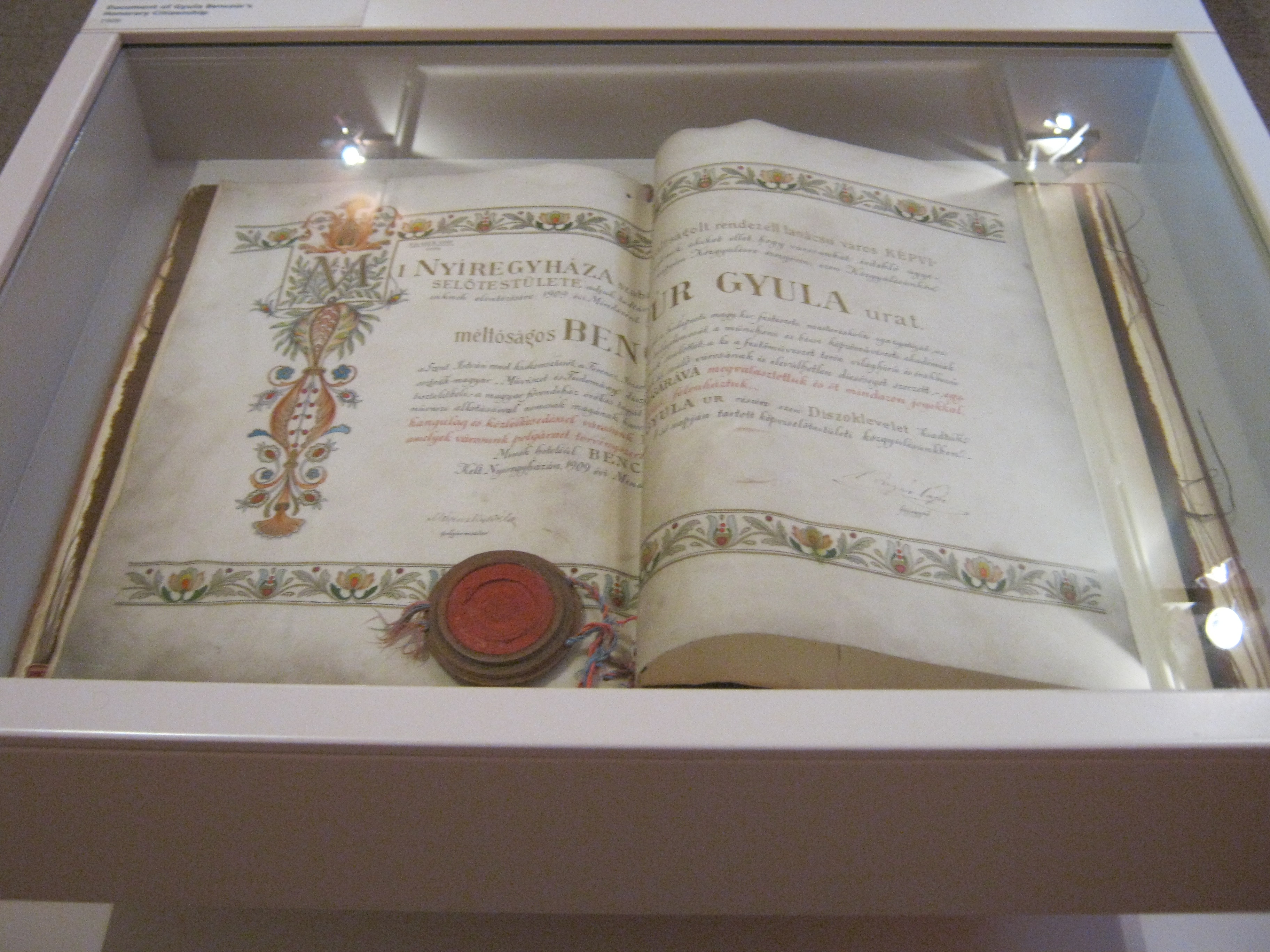 Nyilvános 1124 | 1624 | Nyíregyháza, Benczúr tér 21. Jósa András Múzeum | Magyarország egyik legrégibb múzeumát Dr. Jósa András alapította 1868-ban, akinek ma nevét viseli. A képen Benczúr Gyula emlékszobájának részlete. A nagy magyar festőművész 1844-ben Nyíregyházán született (lásd: Nyíregyháza, Kossuth tér 8.), apja gyógyszerész volt. A Benczúr-emlékszobában alkotásai mellett eredeti bútorok, s a festőművész több használati tárgya is megtekinthető. A képen Benczúr 1909-ből származó díszpolgári oklevele. Felh. irod.: Látnivalók Szabolcs-Szatmár-Bereg megyében. Miskolc, Well-PRess, 1999 http://jam.nyirbone.hu A fénykép 2010 augusztus elején készült. |