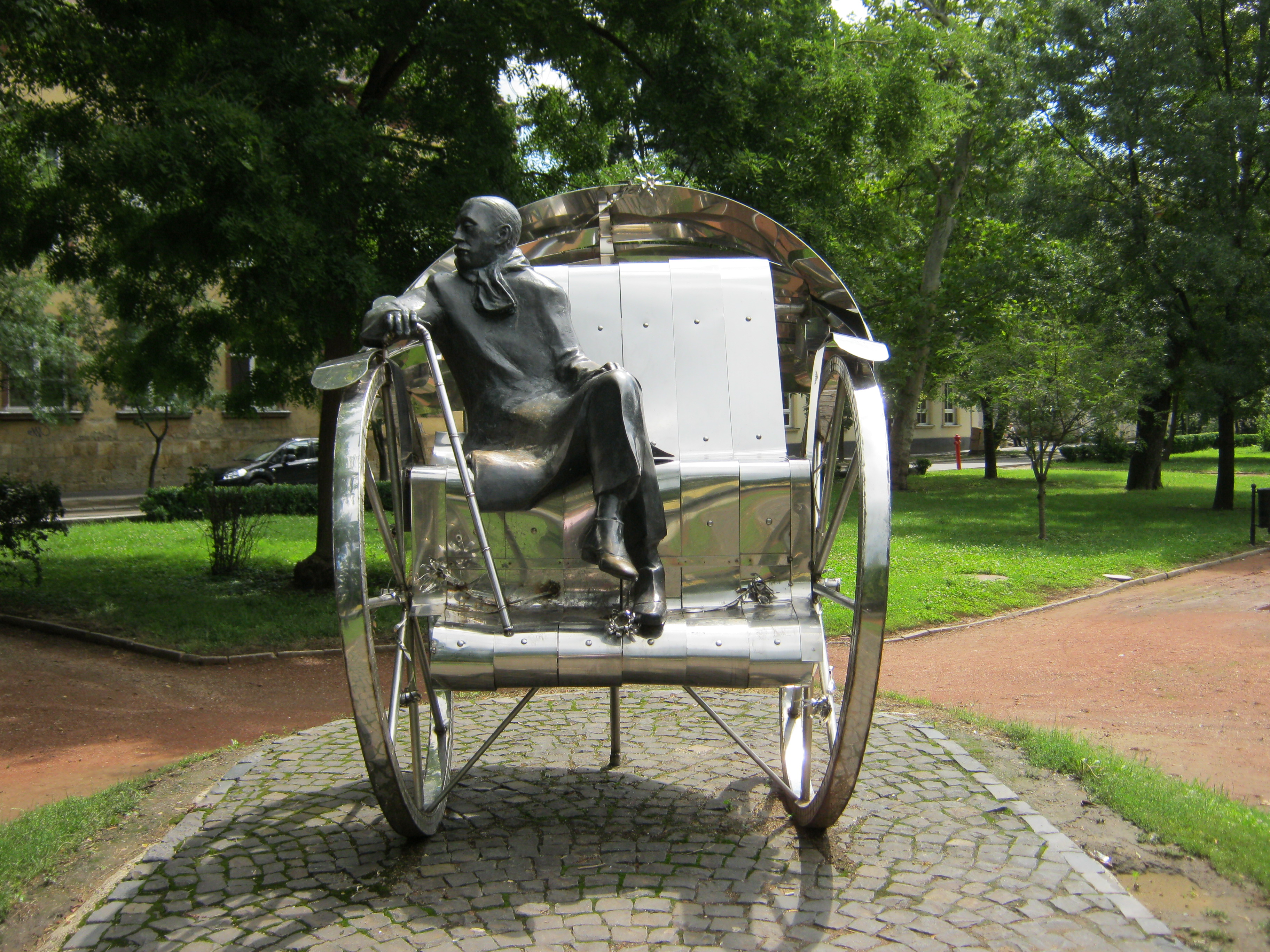 Nyilvános 1142 | 3295 | Nyíregyháza, Bessenyei tér: Krúdy Gyula szobra | A Bessenyei téren 2003-ban avatták fel Varga Imre "Hazatérés" című, Krúdy Gyulának emléket állító szoborkompozícióját. Az alkotást Krúdy: A vörös postakocsi című regénye ihlette. Krúdy Nyíregyházán született (lásd: Nyíregyháza, Szent István utca 8.) és itt végezte a gimnázium (lásd: Nyíregyháza, Szent István u. 17-19.) felsőbb osztályait. A fénykép 2010 augusztus elején készült. |