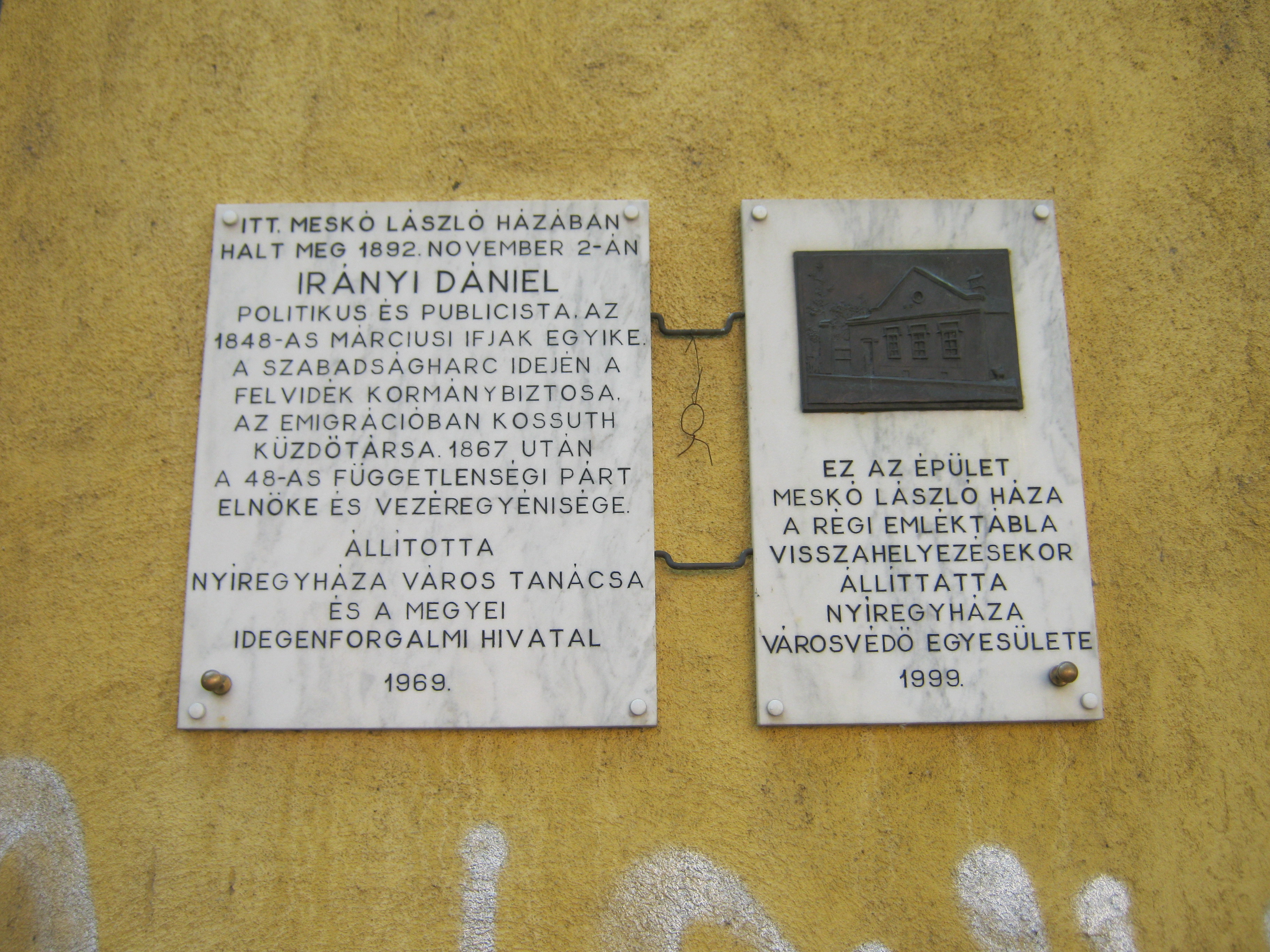 Nyilvános 1135 | 1489 | Nyíregyháza, Dózsa György utca 14. | Az itt álló, valamikor 1969 után lebontott régi, ún. Meskó-házban hunyt el 1892. november 2-án Irányi Dániel politikus, publicista. Az eredeti házat jelölő emléktáblát utódán is elhelyezték egy kiegészítő táblával együtt, amelyen látható a Meskó-ház korabeli képe. A fénykép 2010 augusztus elején készült. |