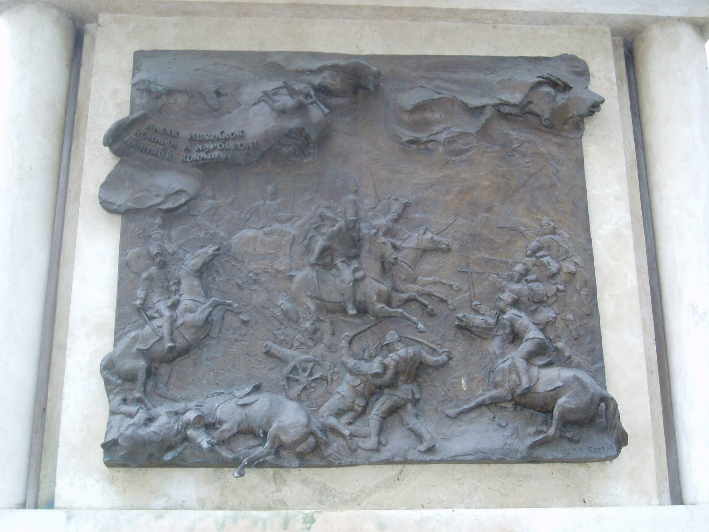 Nyilvános 1091 | 1525 | Nyíregyháza, Országzászló tér: Magyar huszár emlékmű | Győrfi Sándor alkotása az Országzászló téren elhelyezett "A magyar huszár" című emlékmű. A talapzat két oldalán látható domborművek közül az egyik a Hadik-huszárok rohamát idézi fel a napóleoni háborúk korából. Felh. irod.: www.szoborlap.hu A fénykép 2010 augusztus elején készült. |