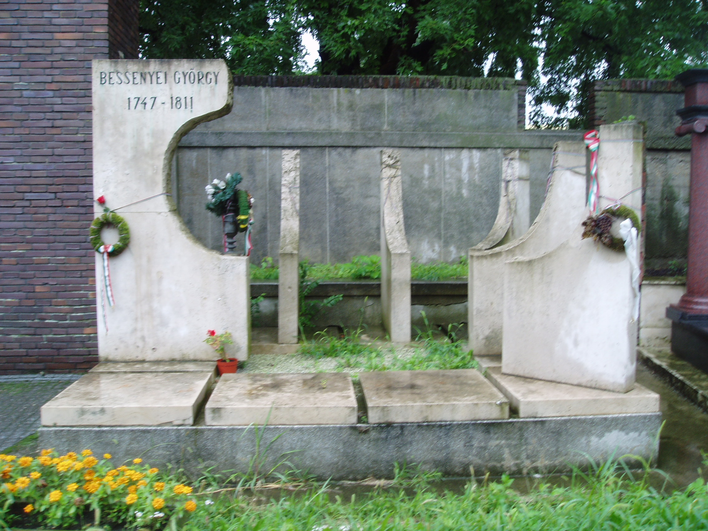 Nyilvános 1137 | 1919 | Nyíregyháza, Pazonyi tér, Északi temető: Bessenyei György sírja | A Dózsa György út vezet Nyíregyháza Északi temetőjébe. A főbejárat közvetlen közelében nyugszik a magyar irodalomtörténet egyik nagy alakja, Bessenyei György (1746/7-1811). Birtokán, Pusztakovácsiban hunyt el, kúriájának kertjében temették el. Hamvait 1940-ben szállították Nyíregyházára. Síremlékét süttői márványból 1982-ben készítette Ráthonyi József. Felh. irod.: Fazekas Árpád - Szekrényes András: Nyíregyháza temetői. Nyíregyháza, 1990 A fénykép 2010 augusztus elején készült |