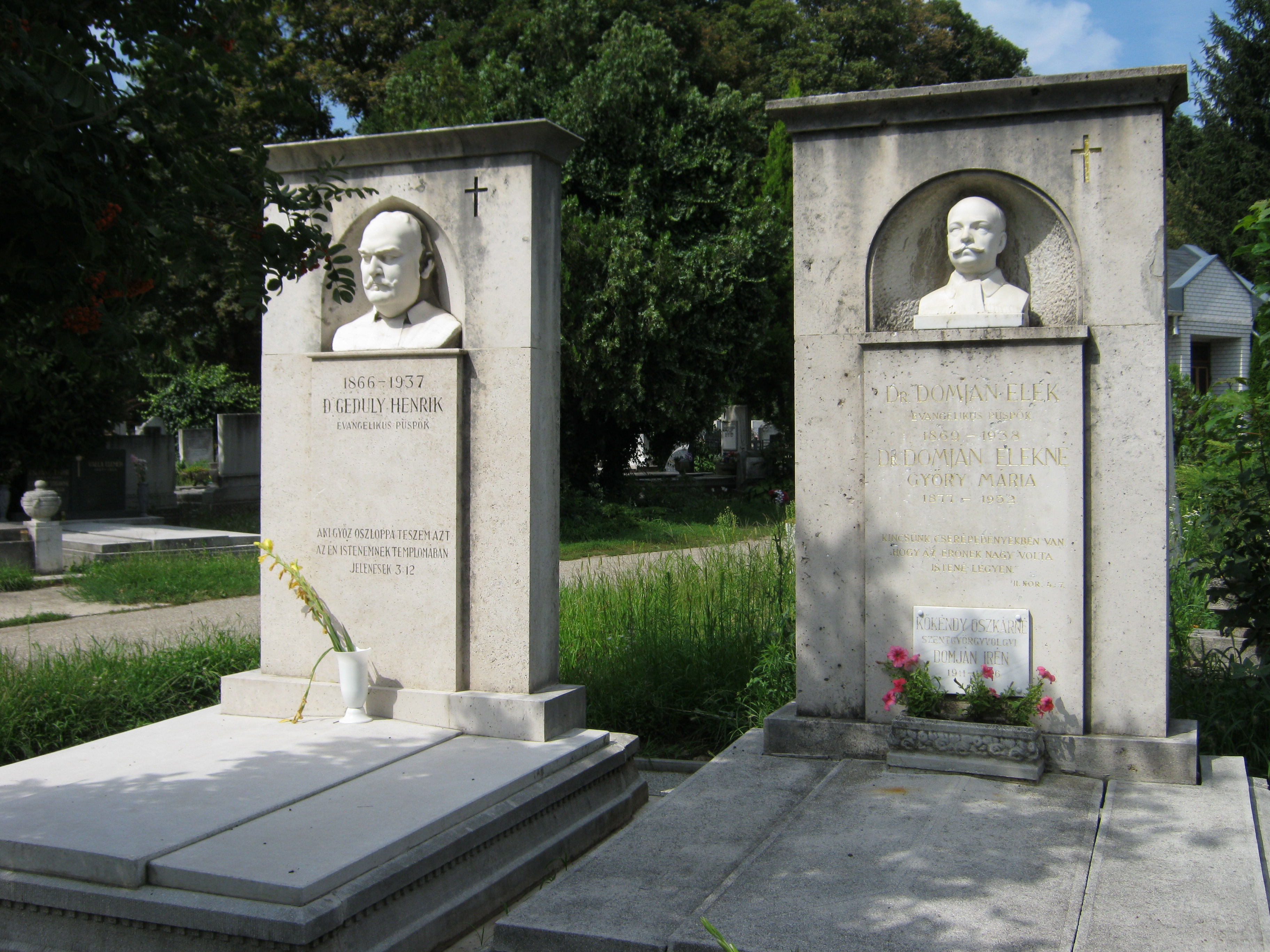 Nyilvános 1166 | 3156 | Nyíregyháza, Pazonyi tér, Északi temető: Geduly Henrik és Domján Elek | A Dózsa György út vezet Nyíregyháza Északi temetőjébe. A ravatalozó mögötti díszsírhelyen nyugszik Nyíregyháza két kiváló személyisége, evangélikus püspöke, dr. Geduly Henrik (1866-1937) és dr. Domján Elek (1869-1928). Felh. irod.: Fazekas Árpád - Szekrényes András: Nyíregyháza temetői. Nyíregyháza, 1990 A fénykép 2010 augusztus elején készült |