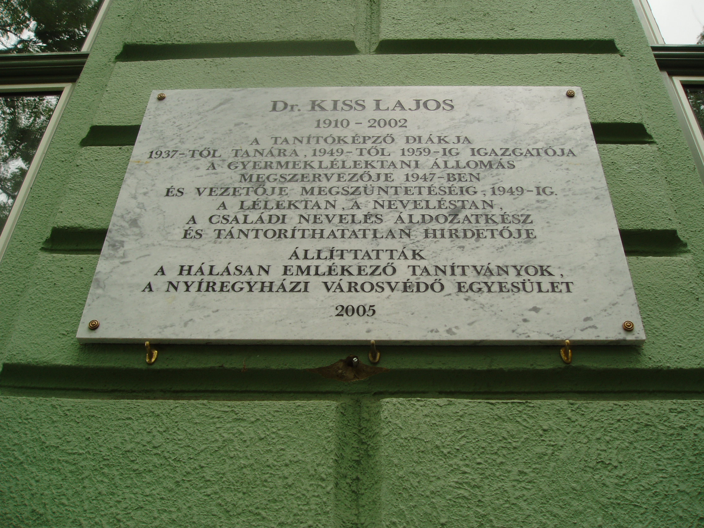 Nyilvános 1096 | 1450 | Nyíregyháza, Széchenyi utca 6. Kölcsey Ferenc Gimnázium | Épületét 1901-ben, Barzó Mihály tervei alapján, pénzügyigazgatósági székháznak emelték. 1925-től, 1957-ben történt megszűnéséig középfokú tanítóképző intézetként működött. Azóta a Kölcsey gimnázium otthona. Az első gimnáziumi osztály 1954/55-ben még egy korábbi épületben kezdte meg a tanulást, de már itt érettségizett 1959-ben. Az iskolaépület homlokzatán több emléktábla idézi az egykori tanítóképző, majd gimnázium neves tanárainak és diákjainak alakját. Kiss Lajos (1910-2002) a tanítóképző diákja, majd tanára volt. Felh. irod.: www.kolcsey-nyh.sulinet.hu A fénykép 2010 augusztus elején készült |