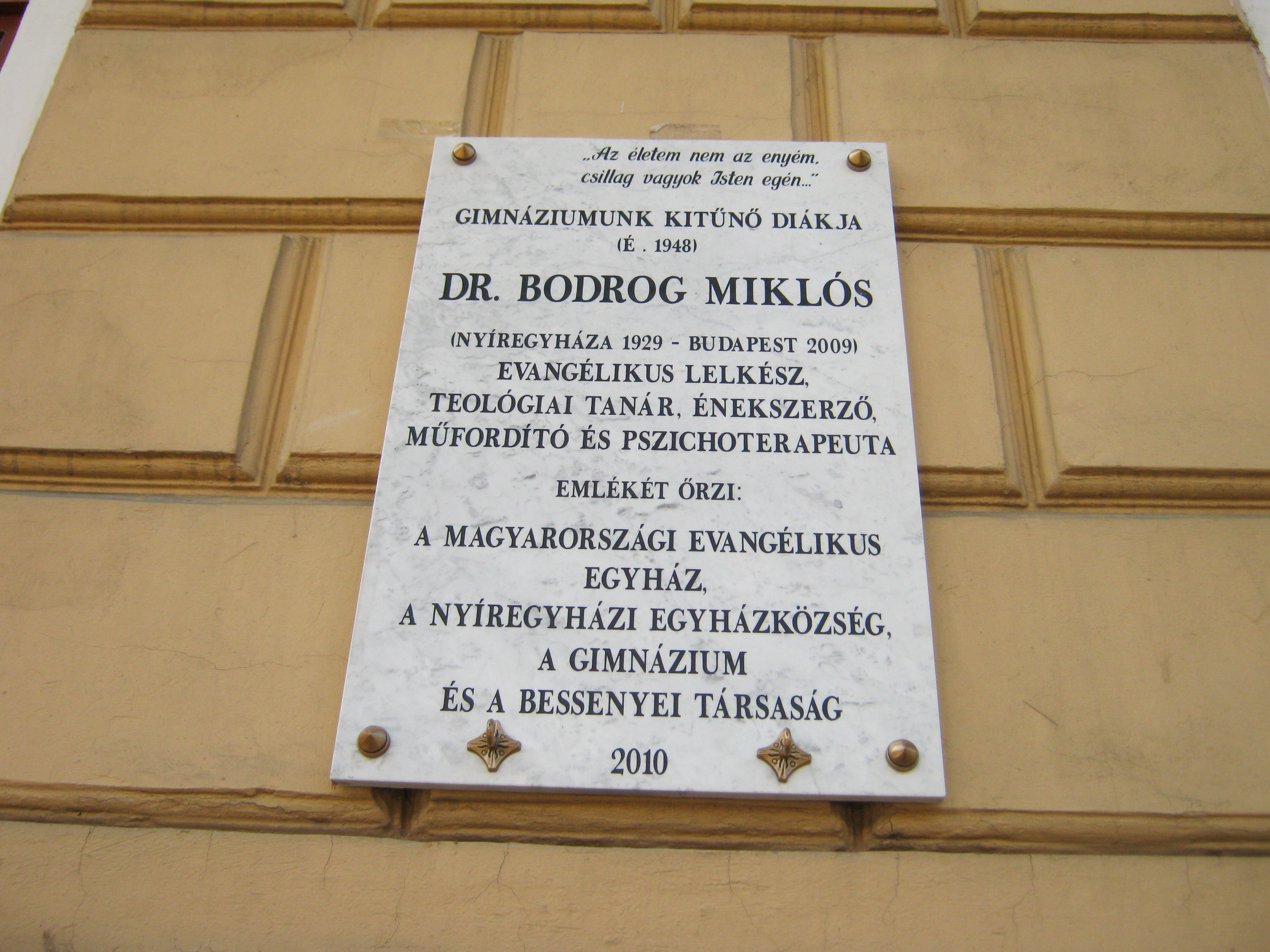 Nyilvános 1102 | 1473 | Nyíregyháza, Szent István utca 19. Evangélikus Kossuth Lajos Gimnázium | A megye legrégibb középiskolája. 1808-ban alapították mint evangélikus professzori iskolát (lásd: Nyíregyháza, Luther utca 5.). Nyolc osztályos gimnáziummá 1888-ra fejlesztették fel. Mai épületét ekkoriban, 1887-ben emelték Bobula János tervei szerint. Kossuth Lajos nevét 1921-ben vette fel. Az 1948-ban államosított iskolát 1992-ben kapta vissza az evangélikus egyház. Homlokzatán számos márványtábla emlékezik kiváló diákjaira, tanáraira. Itt végezte tanulmányait Bodrog Miklós evangélikus lelkész, teológiai tanár, énekszerző és pszichoterapeuta itt érettségizett 1948-ban. Felh. irod.: www.eklg.hu A fénykép 2010 augusztus elején készült |