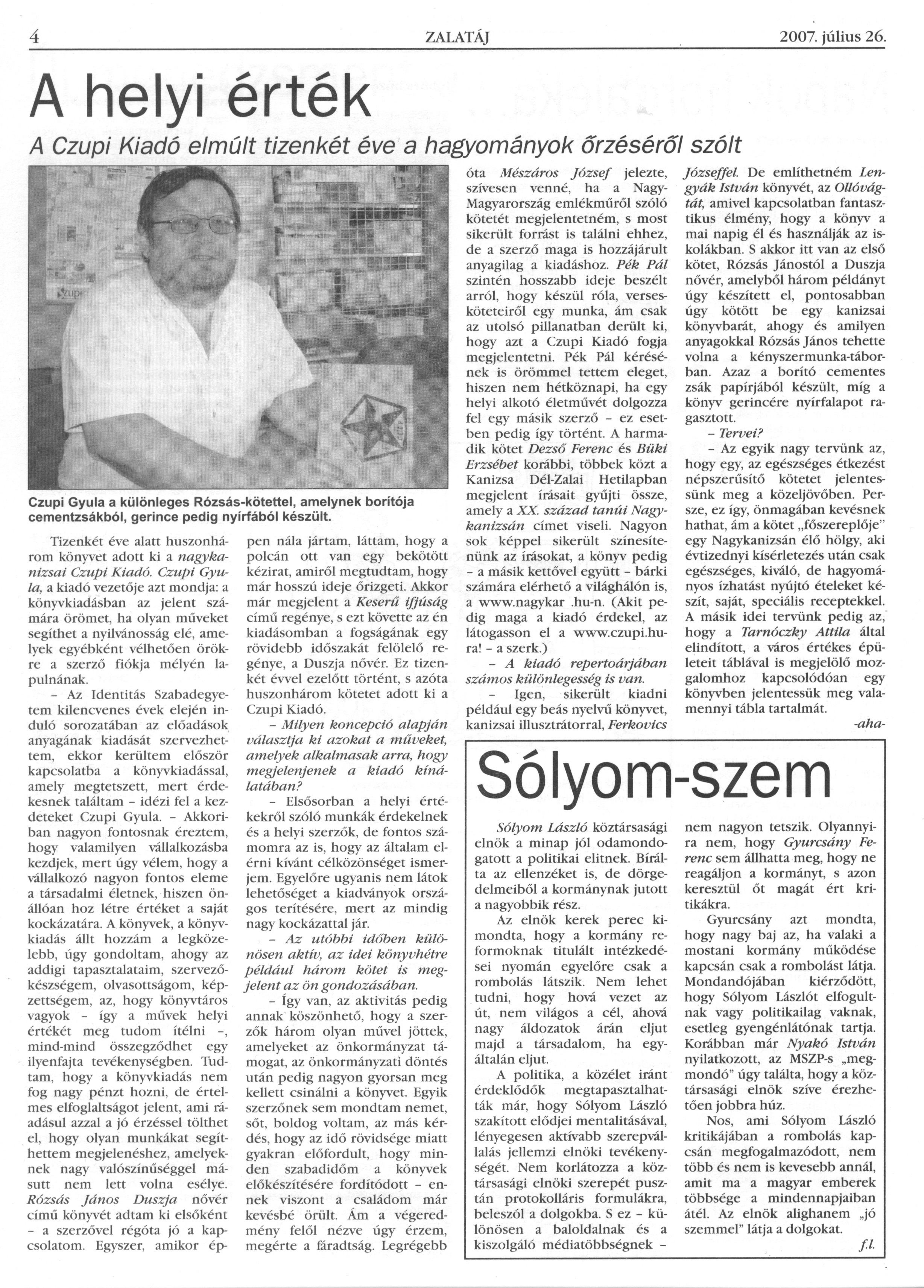 Nyilvános 1406 | 2854 | Zalatáj 2007. július 26. 650. szám 4. oldal | A helyi érték A Czupi Kiadó elmúlt tizenkét éve a hagyományok őrzéséről szólt Czupi Gyula a különleges Rózsás-kötettel, amelynek borítója cementzsákból, gerince pedig nyírfából készült. Tizenkét éve alatt huszonhárom könyvet adott ki a nagykanizsai Czupi Kiadó. Czupi Gyula, a kiadó vezetője azt mondja: a könyvkiadásban az jelent számára örömet, ha olyan műveket segíthet a nyilvánosság elé, amelyek egyébként vélhetően örökre a szerző fiókja mélyén lapulnának. – Az Identitás Szabadegyetem kilencvenes évek elején induló sorozatában az előadások anyagának kiadását szervezhettem, ekkor kerültem először kapcsolatba a könyvkiadással, amely megtetszett, mert érdekesnek találtam – idézi fel a kezdeteket Czupi Gyula. – Akkoriban nagyon fontosnak éreztem, hogy valamilyen vállalkozásba kezdjek, mert úgy vélem, hogy a vállalkozó nagyon fontos eleme a társadalmi életnek, hiszen önállóan hoz létre értéket a saját kockázatára. A könyvek, a könyvkiadás állt hozzám a legközelebb, úgy gondoltam, ahogy az addigi tapasztalataim, szervezőkészségem, olvasottságom, képzettségem, az, hogy könyvtáros vagyok – így a művek helyi értékét meg tudom ítélni –, mind-mind összegződhet egy ilyenfajta tevékenységben. Tudtam, hogy a könyvkiadás nem fog nagy pénzt hozni, de értelmes elfoglaltságot jelent, ami ráadásul azzal a jó érzéssel tölthet el, hogy olyan munkákat segíthettem megjelenéshez, amelyeknek nagy valószínűséggel másutt nem lett volna esélye. Rózsás János Duszja nővér című könyvét adtam ki elsőként – a szerzővel régóta jó a kapcsolatom. Egyszer, amikor éppen nála jártam, láttam, hogy a polcán ott van egy bekötött kézirat, amiről megtudtam, hogy már hosszú ideje őrizgeti. Akkor már megjelent a Keserű ifjúság című regénye, s ezt követte az én kiadásomban a fogságának egy rövidebb időszakát felölelő regénye, a Duszja nővér. Ez tizenkét évvel ezelőtt történt, s azóta huszonhárom kötetet adott ki a Czupi Kiadó. – Milyen koncepció alapján választja ki azokat a műveket, amelyek alkalmasak arra, hogy megjelenjenek a kiadó kínálatában? – Elsősorban a helyi értékekről szóló munkák érdekelnek és a helyi szerzők, de fontos számomra az is, hogy az általam elérni kívánt célközönséget ismerjem. Egyelőre ugyanis nem látok lehetőséget a kiadványok országos terítésére, mert az mindig nagy kockázattal jár. – Az utóbbi időben különösen aktív, az idei könyvhétre például három kötet is megjelent az ön gondozásában. – Így van, az aktivitás pedig annak köszönhető, hogy a szerzők három olyan művel jöttek, amelyeket az önkormányzat támogat, az önkormányzati döntés után pedig nagyon gyorsan meg kellett csinálni a könyvet. Egyik szerzőnek sem mondtam nemet, sőt, boldog voltam, az más kérdés, hogy az idő rövidsége miatt gyakran előfordult, hogy minden szabadidőm a könyvek előkészítésére fordítódott – ennek viszont a családom már kevésbé örült. Ám a végeredmény felől nézve úgy érzem, megérte a fáradtság. Legrégebb óta Mészáros József jelezte, szívesen venné, ha a Nagy-Magyarország emlékműről szóló kötetét megjelentetném, s most sikerült forrást is találni ehhez, de a szerző maga is hozzájárult anyagilag a kiadáshoz. Pék Pál szintén hosszabb ideje beszélt arról, hogy készül róla, versesköteteiről egy munka, ám csak az utolsó pillanatban derült ki, hogy azt a Czupi Kiadó fogja megjelentetni. Pék Pál kérésének is örömmel tettem eleget, hiszen nem hétköznapi, ha egy helyi alkotó életművét dolgozza fel egy másik szerző – ez esetben pedig így történt. A harmadik kötet Dezső Ferenc és Büki Erzsébet korábbi, többek közt a Kanizsa Dél-Zalai Hetilapban megjelent írásait gyűjti össze, amely a XX. század tanúi Nagykanizsán címet viseli. Nagyon sok képpel sikerült színesítenünk az írásokat, a könyv pedig – a másik kettővel együtt – bárki számára elérhető a világhálón is, a www.nagykar.hu-n. (Akit pedig maga a kiadó érdekel, az látogasson el a www.czupi.hu-ra! – a szerk.) – A kiadó repertoárjában számos különlegesség is van. – Igen, sikerült kiadni például egy beás nyelvű könyvet, kanizsai illusztrátorral, Ferkovics Józseffel. De említhetném Lengyák István könyvét, az Ollóvágtát, amivel kapcsolatban fantasztikus élmény, hogy a könyv a mai napig él és használják az iskolákban. S akkor itt van az első kötet, Rózsás Jánostól a Duszja nővér, amelyből három példányt úgy készített el, pontosabban úgy kötött be egy kanizsai könyvbarát, ahogy és amilyen anyagokkal Rózsás János tehette volna a kényszermunka-táborban. Azaz a borító cementes zsák papírjából készült, míg a könyv gerincére nyírfalapot ragasztott. – Tervei? – Az egyik nagy tervünk az, hogy egy, az egészséges étkezést népszerűsítő kötetet jelentessünk meg a közeljövőben. Persze, ez így, önmagában kevésnek hathat, ám a kötet „főszereplője” egy Nagykanizsán élő hölgy, aki évtizednyi kísérletezés után csak egészséges, kiváló, de hagyományos ízhatást nyújtó ételeket készít, saját, speciális receptekkel. A másik idei tervünk pedig az, hogy a Tarnóczky Attila által elindított, a város értékes épületeit táblával is megjelölő mozgalomhoz kapcsolódóan egy könyvben jelentessük meg valamennyi tábla tartalmát. -aha- |