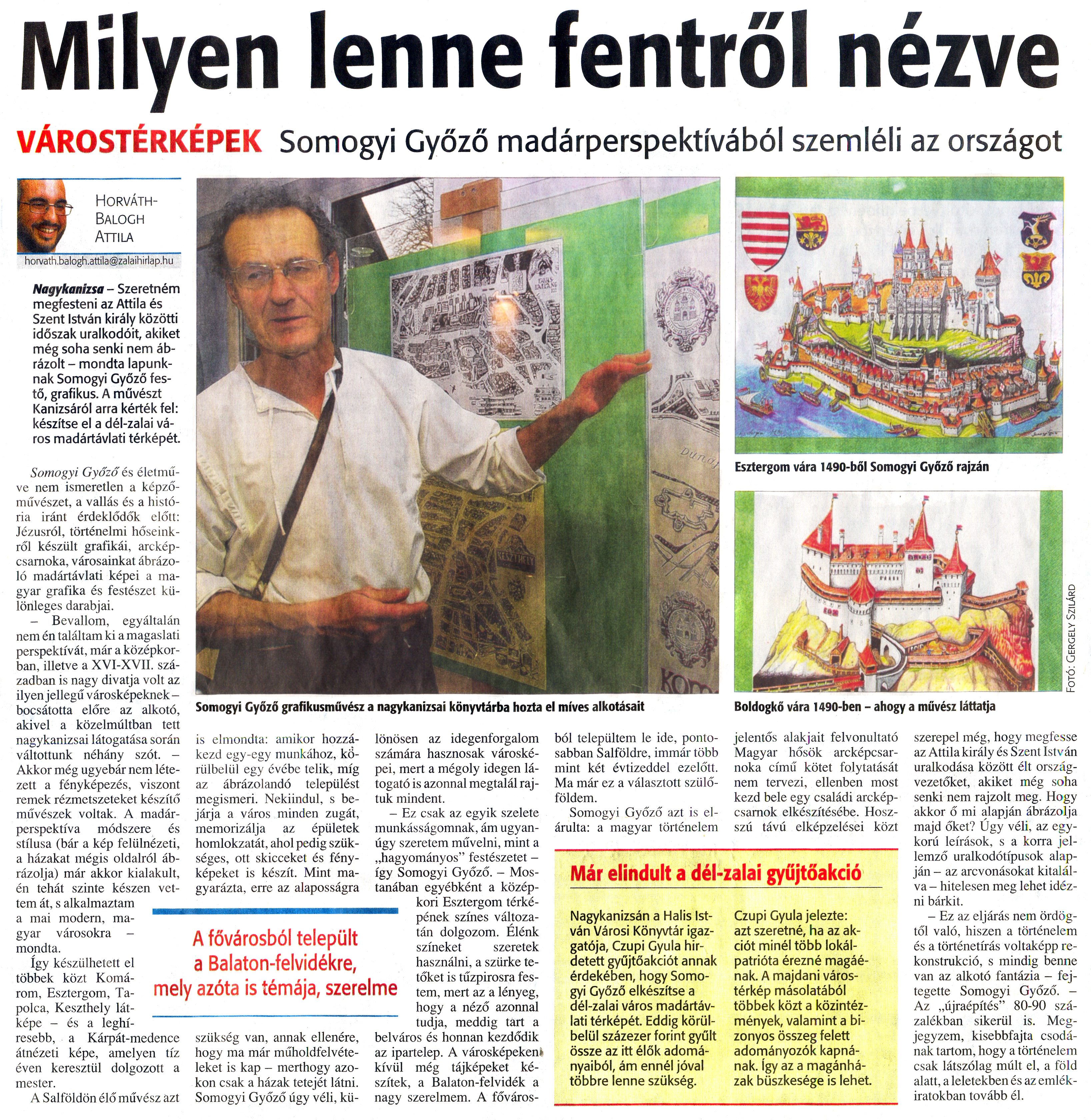 Nyilvános 1273 | 1978 | Zalai Hírlap 2010. január 4. 2. szám 7. oldal - Milyen lenne fentről nézve | A cikk szövege: Milyen lenne fentről nézve VÁROSTÉRKÉPEK Somogyi Győző madárperspektívából szemléli az országot A fővárosból települt a Balaton-felvidékre, mely azóta is témája, szerelme Horváth- Balogh Attila Nagykanizsa - Szeretném megfesteni az Attila és Szent István király közötti időszak uralkodóit, akiket még soha senki nem ábrázolt - mondta lapunknak Somogyi Győző festő, grafikus. A művészt Kanizsáról arra kérték fel: készítse el a dél-zalai város madártávlati térképét. Somogyi Győző és életműve nem ismeretlen a képzőművészet, a vallás és a história iránt érdeklődők előtt: Jézusról, történelmi hőseinkről készült grafikái, arcképcsarnoka, városainkat ábrázoló madártávlati képei a magyar grafika és festészet különleges darabjai. - Bevallom, egyáltalán nem én találtam ki a magaslati perspektívát, már a középkorban, illetve a XVI-XVII. században is nagy divatja volt az ilyen jellegű városképeknek -bocsátotta előre az alkotó, akivel a közelmúltban tett nagykanizsai látogatása során váltottunk néhány szót. - Akkor még ugyebár nem létezett a fényképezés, viszont remek rézmetszeteket készítő művészek voltak. A madárperspektíva módszere és stílusa (bár a kép felülnézeti, a házakat mégis oldalról ábrázolja) már akkor kialakult, én tehát szinte készen vettem át, s alkalmaztam a mai modern, magyar városokra - mondta. Így készülhetett el többek közt Komárom, Esztergom, Tapolca, Keszthely látképe - és a leghíresebb, a Kárpát-medence átnézeti képe, amelyen tíz éven keresztül dolgozott a mester. A Salföldön élő művész azt is elmondta: amikor hozzákezd egy-egy munkához, körülbelül egy évébe telik, míg az ábrázolandó települést megismeri. Nekiindul, s bejárja a város minden zugát, memorizálja az épületek homlokzatát, ahol pedig szükséges, ott skicceket és fényképeket is készít. Mint magyarázta, erre az alaposságra szükség van, annak ellenére, hogy ma már műholdfelvételeket is kap - merthogy azokon csak a házak tetejét látni. Somogyi Győző úgy véli, különösen az idegenforgalom számára hasznosak városképei, mert a mégoly idegen látogató is azonnal megtalál rajtuk mindent. - Ez csak az egyik szelete munkásságomnak, ám ugyanúgy szeretem művelni, mint a „hagyományos" festészetet -így Somogyi Győző. - Mostanában egyébként a középkori Esztergom térképének színes változatán dolgozom. Élénk színeket szeretek használni, a szürke tetőket is tűzpirosra festem, mert az a lényeg, hogy a néző azonnal tudja, meddig tárt a belváros és honnan kezdődik az ipartelep. A városképeken kívül még tájképeket készítek, a Balaton-felvidék a nagy szerelmem. A fővárosból települtem le ide, pontosabban Salföldre, immár több mint két évtizeddel ezelőtt. Ma már ez a választott szülőföldem. Somogyi Győző azt is elárulta: a magyar történelem jelentős alakjait felvonultató Magyar hősök arcképcsarnoka című kötet folytatását nem tervezi, ellenben most kezd bele egy családi arcképcsarnok elkészítésébe. Hosszú távú elképzelései közt szerepel még, hogy megfesse az Attila király és Szent István uralkodása között élt országvezetőket, akiket még soha senki nem rajzolt meg. Hogy akkor ő mi alapján ábrázolja majd őket? Úgy véli, az egykorú leírások, s a korra jellemző uralkodótípusok alapján - az arcvonásokat kitalálva - hitelesen meg lehet idézni bárkit. - Ez az eljárás nem ördögtől való, hiszen a történelem és a történetírás voltaképp rekonstrukció, s mindig benne van az alkotó fantázia - fejtegette Somogyi Győző. -Az „újraépítés" 80-90 százalékban sikerül is. Megjegyzem, kisebbfajta csodának tartom, hogy a történelem csak látszólag múlt el, a föld alatt, a leletekben és az emlékiratokban tovább él. Somogyi Győző grafikusművész a nagykanizsai könyvtárba hozta el míves alkotásait Esztergom vára 1490-ből Somogyi Győző rajzán Boldogkő vára 1490-ben - ahogy a művész láttatja Már elindult a dél-zalai gyűjtőakció Nagykanizsán a Halis István Városi Könyvtár igazgatója, Czupi Gyula hirdetett gyűjtőakciót annak érdekében, hogy Somogyi Győző elkészítse a dél-zalai város madártávlati térképét. Eddig körülbelül százezer forint gyűlt össze az itt élők adományaiból, ám ennél jóval többre lenne szükség. Czupi Gyula jelezte: azt szeretné, ha az akciót minél több lokálpatrióta érezné magáénak. A majdani várostérkép másolatából többek közt a közintézmények, valamint a bizonyos összeg felett adományozók kapnának, így az a magánházak büszkesége is lehet. |