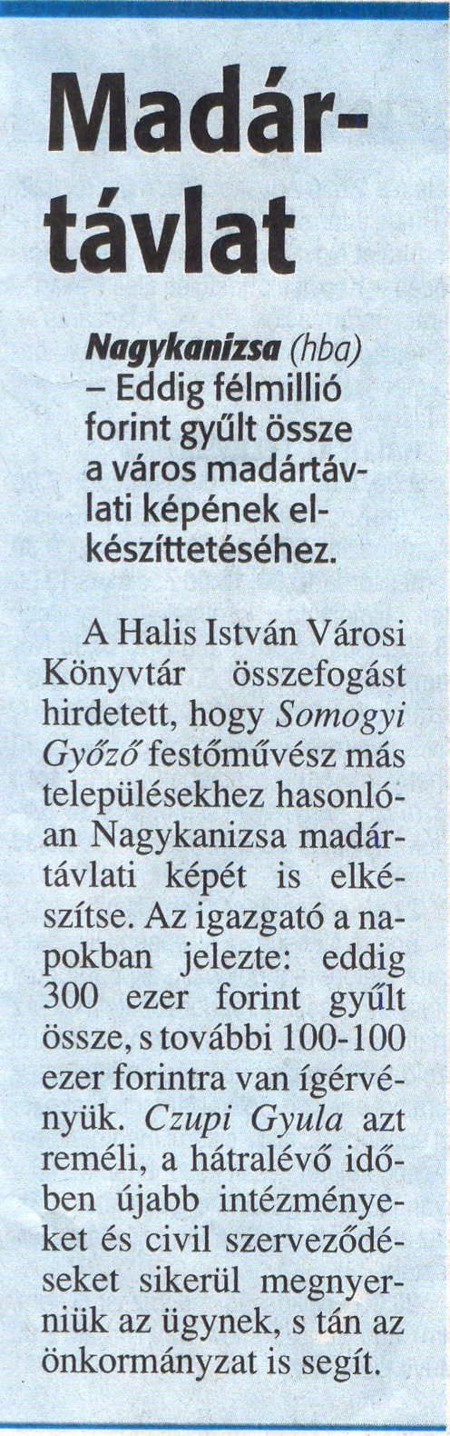 Nyilvános 1264 | 1779 | Zalai Hírlap 2010. február 9. 33. szám 7. oldal - Madártávlat | A cikk szövege: Madártávlat Nagykanizsa (hba) - Eddig félmillió forint gyűlt össze a város madártávlati képének elkészíttetéséhez. A Halis István Városi Könyvtár összefogást hirdetett, hogy Somogyi Győző festőművész más településekhez hasonlóan Nagykanizsa madártávlati képét is elkészítse. Az igazgató a napokban jelezte: eddig 300 ezer forint gyűlt össze, s további 100-100 ezer forintra van ígérvényük. Czupi Gyula azt reméli, a hátralévő időben újabb intézményeket és civil szerveződéseket sikerül megnyerniük az ügynek, s tán az önkormányzat is segít. |