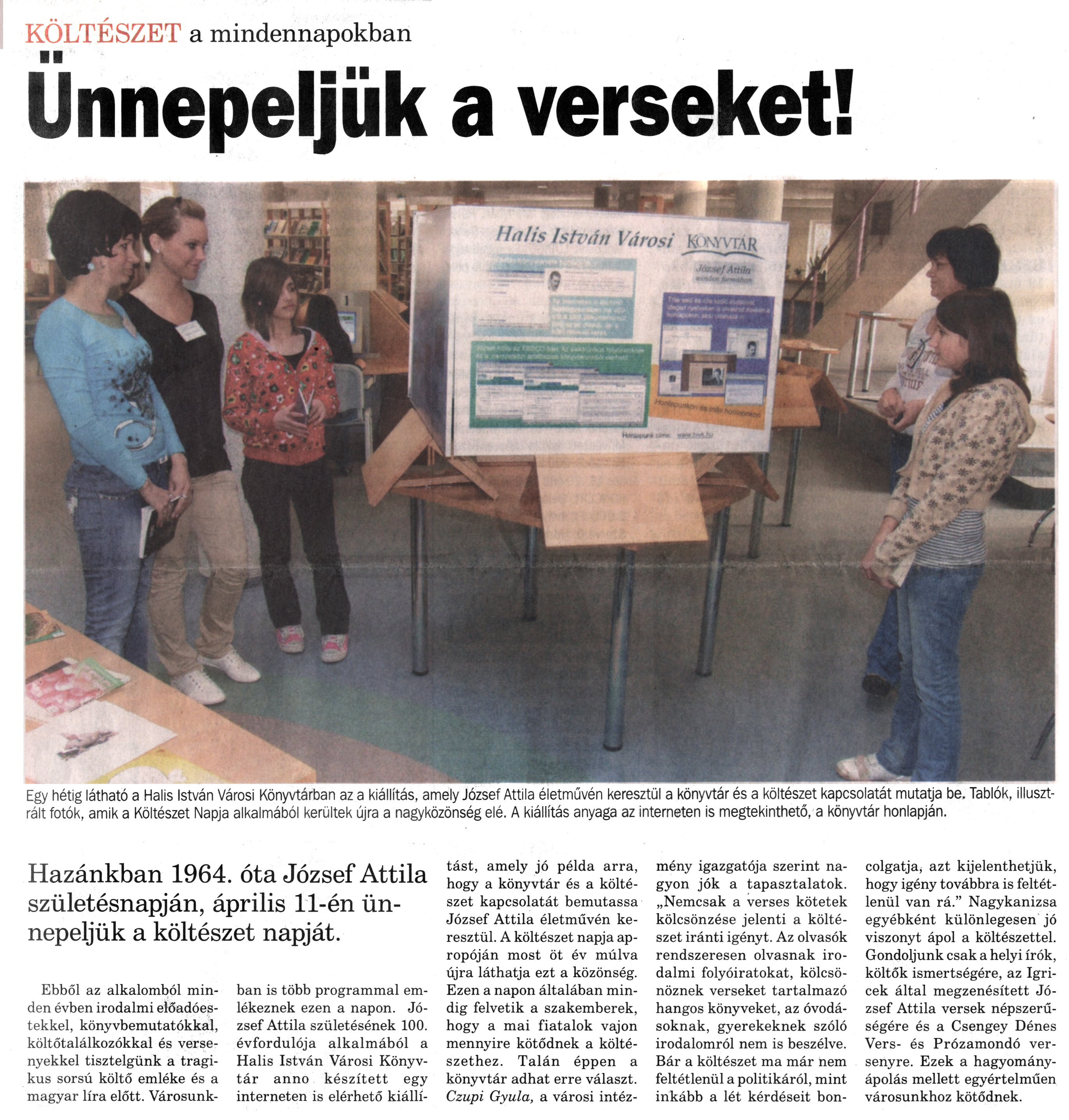 Nyilvános 1302 | 1946 | Nagykanizsai Maraton 2010. április 9. 14. szám 1. oldal - Ünnepeljük a verseket | A cikk szövege: KÖLTÉSZET a mindennapokban Ünnepeljük a verseket! Egy hétig látható a Halis István Városi Könyvtárban az a kiállítás, amely József Attila életművén keresztül a könyvtár és a költészet kapcsolatát mutatja be. Tablók, illusztrált fotók, amik a Költészet Napja alkalmából kerültek újra a nagyközönség elé. A kiállítás anyaga az interneten is megtekinthető, a könyvtár honlapján. Hazánkban 1964. óta József Attila születésnapján, április 11-én ünnepeljük a költészet napját. Ebből az alkalomból minden évben irodalmi előadóestekkel, könyvbemutatókkal, költőtalálkozókkal és versenyekkel tisztelgünk a tragikus sorsú költő emléke és a magyar líra előtt. Városunkban is több programmal emlékeznek ezen a napon. József Attila születésének 100. évfordulója alkalmából a Halis István Városi Könyvtár anno készített egy interneten is elérhető kiállítást, amely jó példa arra, hogy a könyvtár és a költészet kapcsolatát bemutassa József Attila életművén keresztül. A költészet napja apropóján most öt év múlva újra láthatja ezt a közönség. Ezen a napon általában mindig felvetik a szakemberek, hogy a mai fiatalok vajon mennyire kötődnek a költészethez. Talán éppen a könyvtár adhat erre választ. Czupi Gyula, a városi intézmény igazgatója szerint nagyon jók a tapasztalatok. „Nemcsak a verses kötetek kölcsönzése jelenti a költészet iránti igényt. Az olvasók rendszeresen olvasnak irodalmi folyóiratokat, kölcsönöznek verseket tartalmazó hangos könyveket, az óvodásoknak, gyerekeknek szóló irodalomról nem is beszélve. Bár a költészet ma már nem feltétlenül a politikáról, mint inkább a lét kérdéseit boncolgatja, azt kijelenthetjük, hogy igény továbbra is feltétlenül van rá." Nagykanizsa egyébként különlegesen jó viszonyt ápol a költészettel. Gondoljunk csak a helyi írók, költők ismertségére, az Igricek által megzenésített József Attila versek népszerűségére és a Csengey Dénes Vers- és Prózamondó versenyre. Ezek a hagyományápolás mellett egyértelműen városunkhoz kötődnek. |