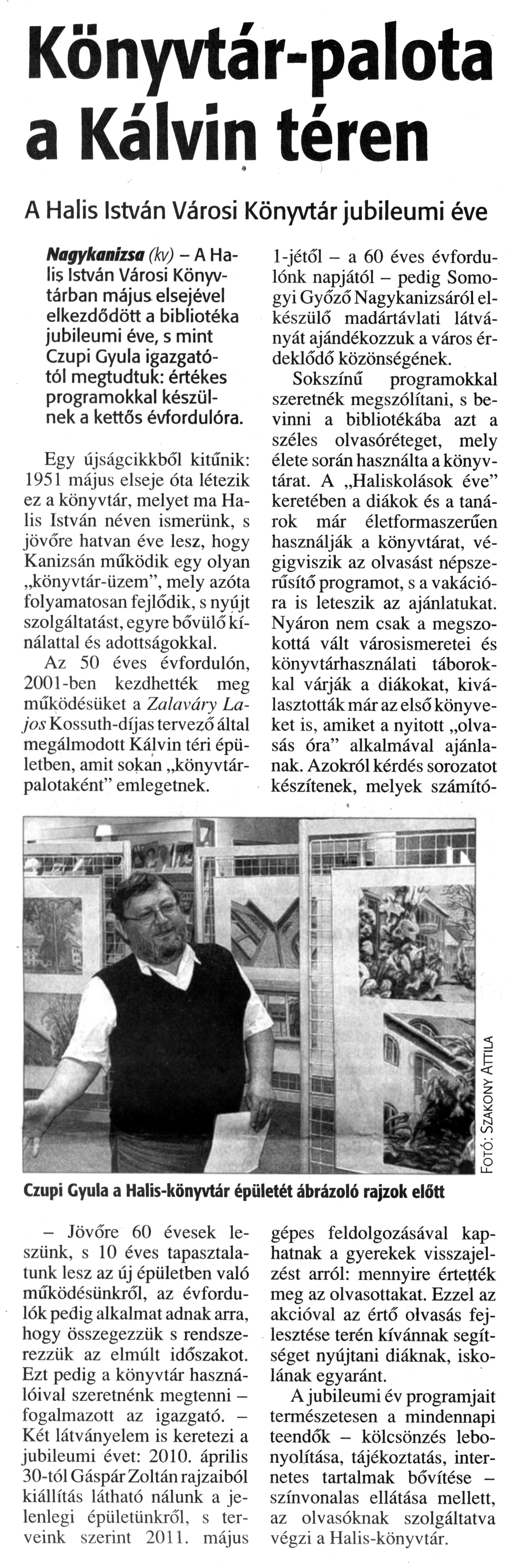 Nyilvános 1261 | 1898 | Zalai Hírlap 2010. május 10. 107. szám 7. oldal - Könyvtár-palota a Kálvin téren | A cikk szövege: Könyvtár-palota a Kálvin téren A Halis István Városi Könyvtár jubileumi éve Nagykanizsa (kv) - A Halis István Városi Könyvtárban május elsejével elkezdődött a bibliotéka jubileumi éve, s mint Czupi Gyula igazgatótól megtudtuk: értékes programokkal készülnek a kettős évfordulóra. Egy újságcikkből kitűnik: 1951 május elseje óta létezik ez a könyvtár, melyet ma Halis István néven ismerünk, s jövőre hatvan éve lesz, hogy Kanizsán működik egy olyan „könyvtár-üzem”, mely azóta folyamatosan fejlődik, s nyújt szolgáltatást, egyre bővülő kínálattal és adottságokkal. Az 50 éves évfordulón, 2001-ben kezdhették meg működésüket a Zalaváry Lajos Kossuth-díjas tervező által megálmodott Kálvin téri épületben, amit sokan „könyvtárpalotaként" emlegetnek. - Jövőre 60 évesek leszünk, s 10 éves tapasztalatunk lesz az új épületben való működésünkről, az évfordulók pedig alkalmat adnak arra, hogy összegezzük s rendszerezzük az elmúlt időszakot. Ezt pedig a könyvtár használóival szeretnénk megtenni -fogalmazott az igazgató. -Két látványelem is keretezi a jubileumi évet: 2010. április 30-tól Gáspár Zoltán rajzaiból kiállítás látható nálunk a jelenlegi épületünkről, s terveink szerint 2011. május 1-jétől - a 60 éves évfordulónk napjától - pedig Somogyi Győző Nagykanizsáról elkészülő madártávlati látványát ajándékozzuk a város érdeklődő közönségének. Sokszínű programokkal szeretnék megszólítani, s bevinni a bibliotékába azt a széles olvasóréteget, mely élete során használta a könyvtárat. A „Haliskolások éve” keretében a diákok és a tanárok már életformaszerűen használják a könyvtárat, végigviszik az olvasást népszerűsítő programot, s a vakációra is leteszik az ajánlatukat. Nyáron nem csak a megszokottá vált városismeretei és könyvtárhasználati táborokkal várják a diákokat, kiválasztották már az első könyveket is, amiket a nyitott „olvasás óra" alkalmával ajánlanak. Azokról kérdés sorozatot készítenek, melyek számítógépes feldolgozásával kaphatnak a gyerekek visszajelzést arról: mennyire értették meg az olvasottakat. Ezzel az akcióval az értő olvasás fejlesztése terén kívánnak segítséget nyújtani diáknak, iskolának egyaránt. A jubileumi év programjait természetesen a mindennapi teendők - kölcsönzés lebonyolítása, tájékoztatás, internetes tartalmak bővítése -színvonalas ellátása mellett, az olvasóknak szolgáltatva végzi a Halis-könyvtár. Czupi Gyula a Halis-könyvtár épületét ábrázoló rajzok előtt |