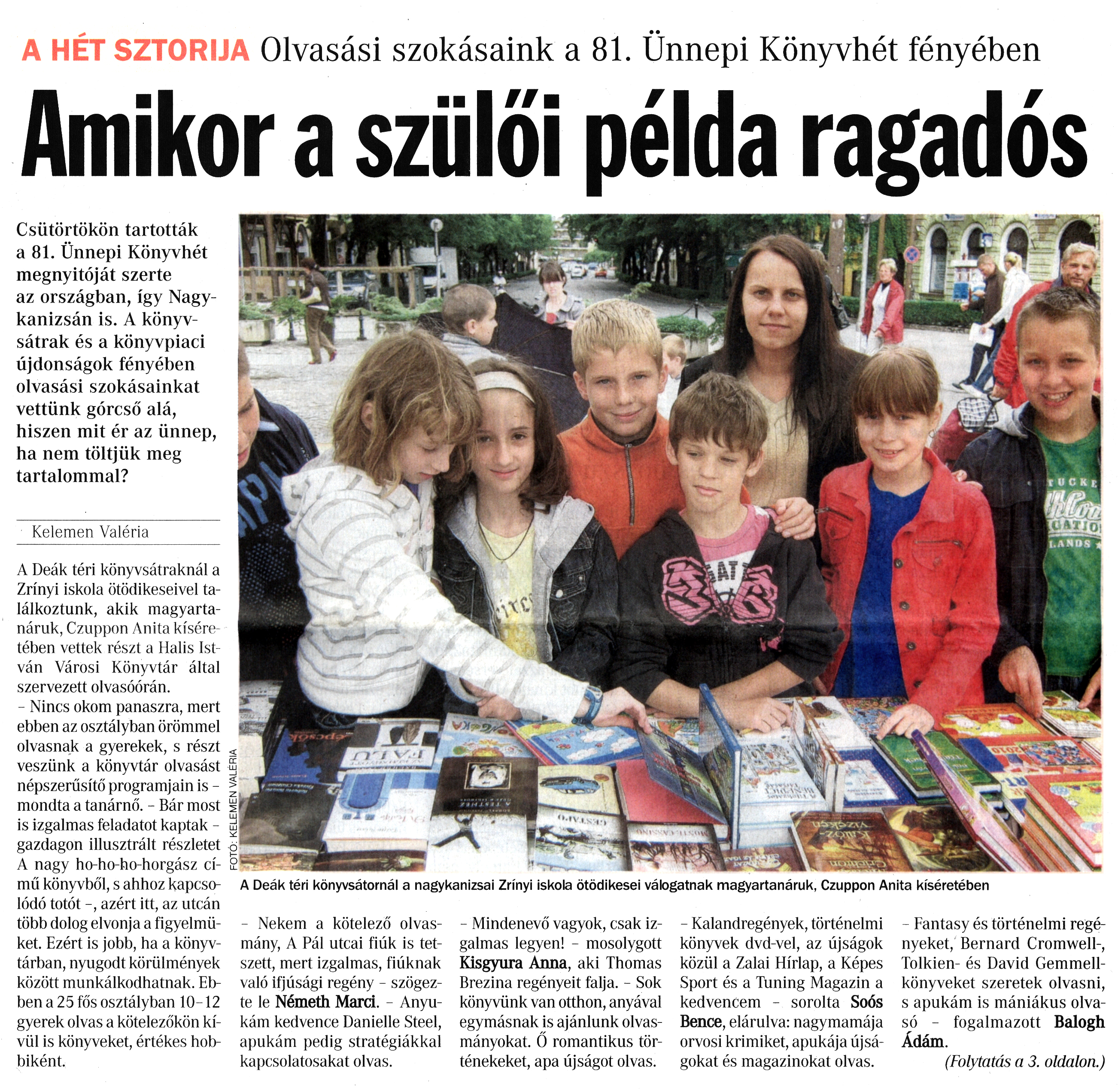 Nyilvános 1188 | 1845 | Vasárnapi Zalai Hírlap 2010. június 6. 22. szám 1. oldal - Amikor a szülői példa ragadós | A cikk szövege: A HÉT SZTORIJA Olvasási szokásaink a 81. Ünnepi Könyvhét fényében Amikor a szülői példa ragadós Csütörtökön tartották a 81. Ünnepi Könyvhét megnyitóját szerte az országban, így Nagykanizsán is. A könyvsátrak és a könyvpiaci újdonságok fényében olvasási szokásainkat vettünk górcső alá, hiszen mit ér az ünnep, ha nem töltjük meg tartalommal? Kelemen Valéria A Deák téri könyvsátraknál a Zrínyi iskola ötödikeseivel találkoztunk, akik magyartanáruk, Czuppon Anita kíséretében vettek részt a Halis István Városi Könyvtár által szervezett olvasóórán. - Nincs okom panaszra, mert ebben az osztályban örömmel olvasnak a gyerekek, s részt veszünk a könyvtár olvasást népszerűsítő programjain is -mondta a tanárnő. - Bár most is izgalmas feladatot kaptak - gazdagon illusztrált részletet A nagy ho-ho-ho-horgász című könyvből, s ahhoz kapcsolódó totót -, azért itt, az utcán több dolog elvonja a figyelmüket. Ezért is jobb, ha a könyvtárban, nyugodt körülmények között munkálkodhatnak. Ebben a 25 fős osztályban 10-12 gyerek olvas a kötelezőkön kívül is könyveket, értékes hobbiként. - Nekem a kötelező olvasmány, A Pál utcai fiúk is tetszett, mert izgalmas, fiúknak való ifjúsági regény - szögezte le Németh Marci. - Anyukám kedvence Danielle Steel, apukám pedig stratégiákkal kapcsolatosakat olvas. - Mindenevő vagyok, csak izgalmas legyen! - mosolygott Kisgyura Anna, aki Thomas Brezina regényeit falja. - Sok könyvünk van otthon, anyával egymásnak is ajánlunk olvasmányokat. Ő romantikus történekeket, apa újságot olvas. - Kalandregények, történelmi könyvek dvd-vel, az újságok közül a Zalai Hírlap, a Képes Sport és a Tuning Magazin a kedvencem - sorolta Soós Bence, elárulva: nagymamája orvosi krimiket, apukája újságokat és magazinokat olvas. - Fantasy és történelmi regényeket, Bernard Cromwell-, Tolkien- és David Gemmell-könyveket szeretek olvasni, s apukám is mániákus olvasó - fogalmazott Balogh Ádám. (Folytatás a 3. oldalon.) A Deák téri könyvsátornál a nagykanizsai Zrínyi iskola ötödikesei válogatnak magyartanáruk, Czuppon Anita kíséretében |