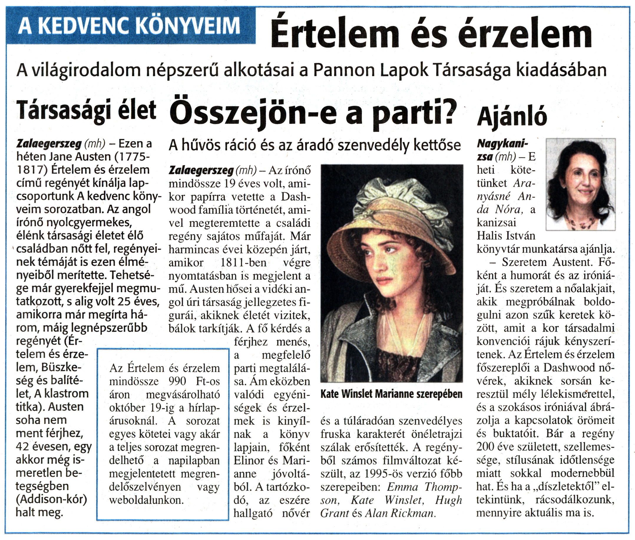 Nyilvános 1267 | 1523 | Zalai Hírlap 2010. október 13. 239. szám 7. oldal - Könyvajánló | A cikk szövege: A KEDVENC KÖNYVEIM Értelem és érzelem A világirodalom népszerű alkotásai a Pannon Lapok Társasága kiadásában Társasági élet Zalaegerszeg (mh) - Ezen a héten Jane Austen (1775-1817) Értelem és érzelem című regényét kínálja lapcsoportunk A kedvenc könyveim sorozatban. Az angol írónő nyolcgyermekes, élénk társasági életet élő családban nőtt fel, regényeinek témáját is ezen élményeiből merítette. Tehetsége már gyerekfejjel megmutatkozott, s alig volt 25 éves, amikorra már megírta három, máig legnépszerűbb regényét (Értelem és érzelem, Büszkeség és balítélet, A klastrom titka). Austen soha nem ment férjhez, 42 évesen, egy akkor még ismeretlen betegségben (Addison-kór) halt meg. Az Értelem és érzelem mindössze 990 Ft-os áron megvásárolható október 19-ig a hírlapárusoknál. A sorozat egyes kötetei vagy akár a teljes sorozat megrendelhető a napilapban megjelentetett megrendelőszelvényen vagy weboldalunkon. Összejön-e a parti? A hűvös ráció és az áradó szenvedély kettőse Zalaegerszeg (mh) - Az írónő mindössze 19 éves volt, amikor papírra vetette a Dashwood família történetét, amivel megteremtette a családi regény sajátos műfaját. Már harmincas évei közepén járt, amikor 1811-ben végre nyomtatásban is megjelent a mű. Austen hősei a vidéki angol úri társaság jellegzetes figurái, akiknek életét vizitek, bálok tarkítják. A fő kérdés a férjhez menés, a megfelelő parti megtalálása. Ám eközben valódi egyéniségek és érzelmek is kinyílnak a könyv lapjain, főként Elinor és Marianne jóvoltából. A tartózkodó, az eszére hallgató nővér Kate Winslet Marianne szerepében és a túláradóan szenvedélyes fruska karakterét önéletrajzi szálak erősítették. A regényből számos filmváltozat készült, az 1995-ös verzió főbb szerepeiben: Emma Thompson, Kate Winslet, Hugh Grant és Alan Rickman. Ajánló Nagykanizsa (mh) - E heti kötetünket Aranyásné Anda Nóra, a kanizsai Halis István könyvtár munkatársa ajánlja. - Szeretem Austent. Főként a humorát és az iróniáját. És szeretem a nőalakjait, akik megpróbálnak boldogulni azon szűk keretek között, amit a kor társadalmi konvenciói rájuk kényszerítenek. Az Értelem és érzelem főszereplői a Dashwood nővérek, akiknek sorsán keresztül mély lélekismerettel, és a szokásos iróniával ábrázolja a kapcsolatok örömeit és buktatóit. Bár a regény 200 éve született, szellemessége, stílusának időtlensége miatt sokkal modernebbül hat. És ha a „díszletektől" eltekintünk, rácsodálkozunk, mennyire aktuális ma is. |
